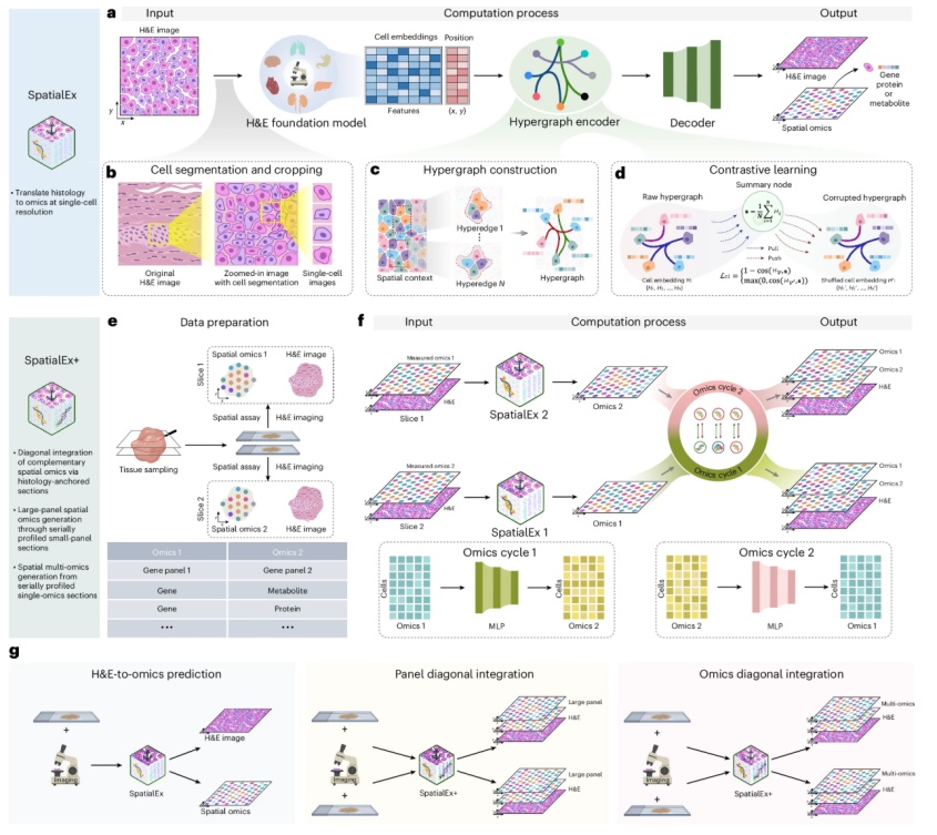 SpatialEx结合H&E基础模型、超图学习框架与对比学习策略,能够直接依据常规H&E组织切片,在全切片范围内预测出单细胞分辨率的空间组学数据。在SpatialEx的基础上,SpatialEx+引入原创性的组学循环(omics cycle)模块,通过将多个切片上训练的 SpatialEx 模型进行高效链接,可以实现:(1)不同基因面板之间的跨维度信息补全;(2)多组学之间的联合约束与一致性增强。本研究为未来的空间多组学研究提供了一个强大、通用且成本效益高的计算解决方案。