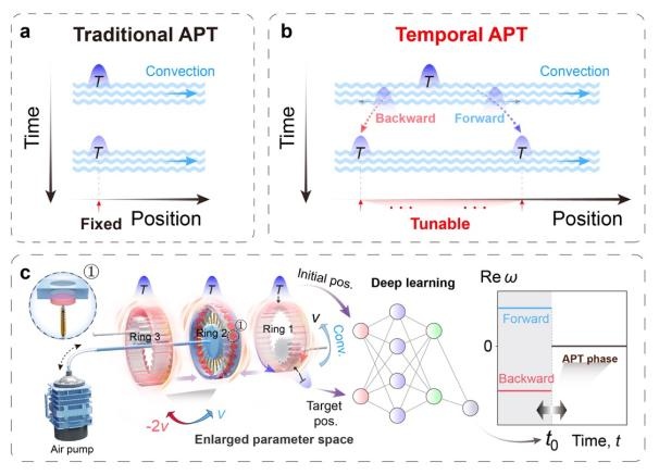 图:工程设计时间调制反宇称时间对称性。a, 传统反宇称时间对称性:抑制对流实现局域俘获,热波包随时间逐渐衰减。b, 时间调制反宇称时间对称性:在相同对流条件下可编程地顺流/逆流输运温度波包,并在任意位置锁定。c, 实验平台与时序协议:三同心旋转环与介质/速度的同步切换,深度学习预测最优切换时刻。