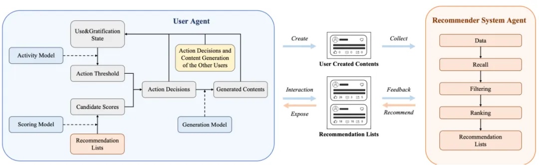该工作基于大模型多智能体协同与使用满足理论(UGT)提出了一种面向在线社区推荐系统的通用模拟基础框架RECOSIM,为在虚拟环境中系统研究“推荐算法-用户行为-社区结构”的协同演化提供了可扩展的实验平台,标志着在线社区智能传播生态系统方向上的重要原创性进展。
