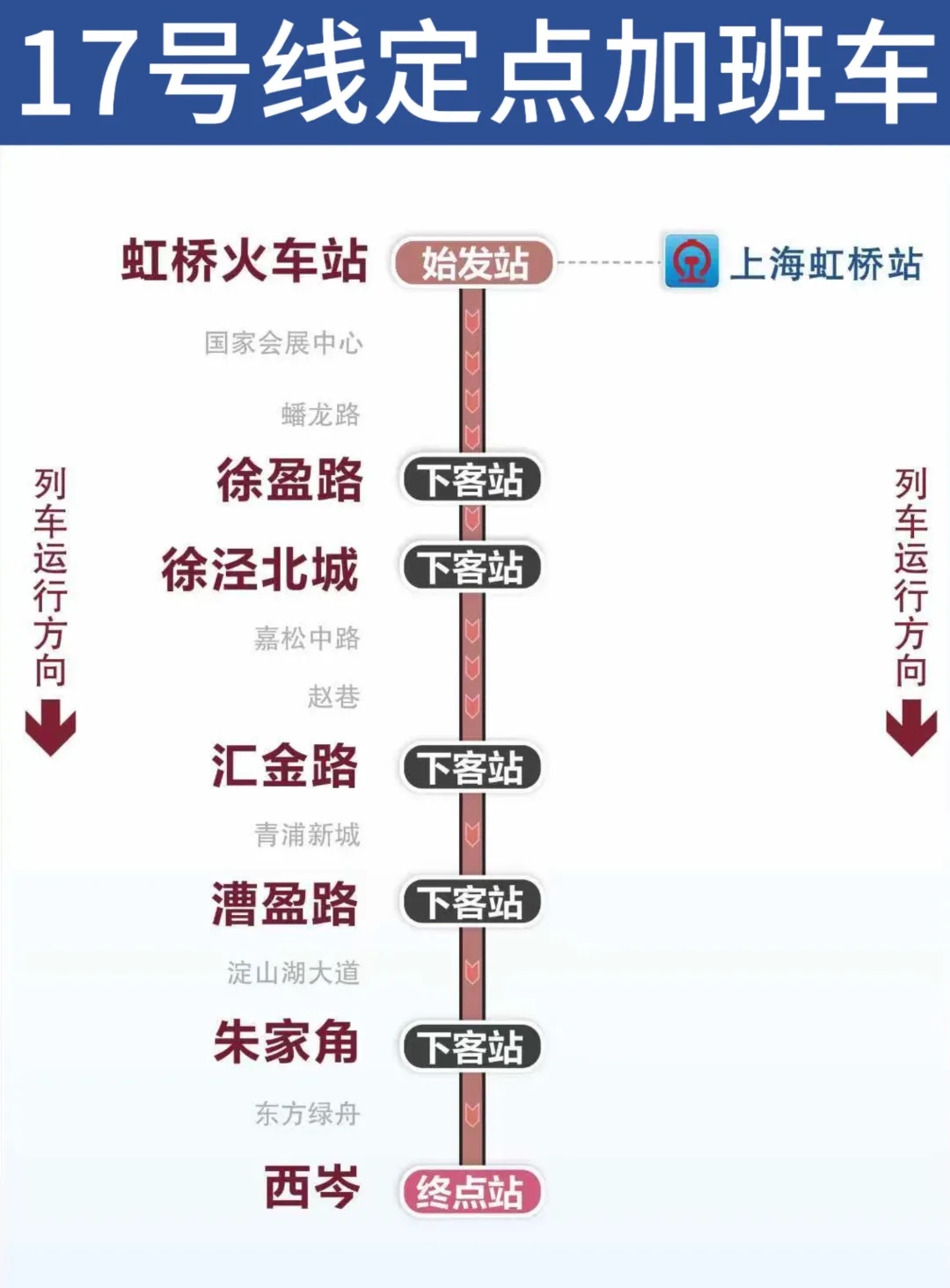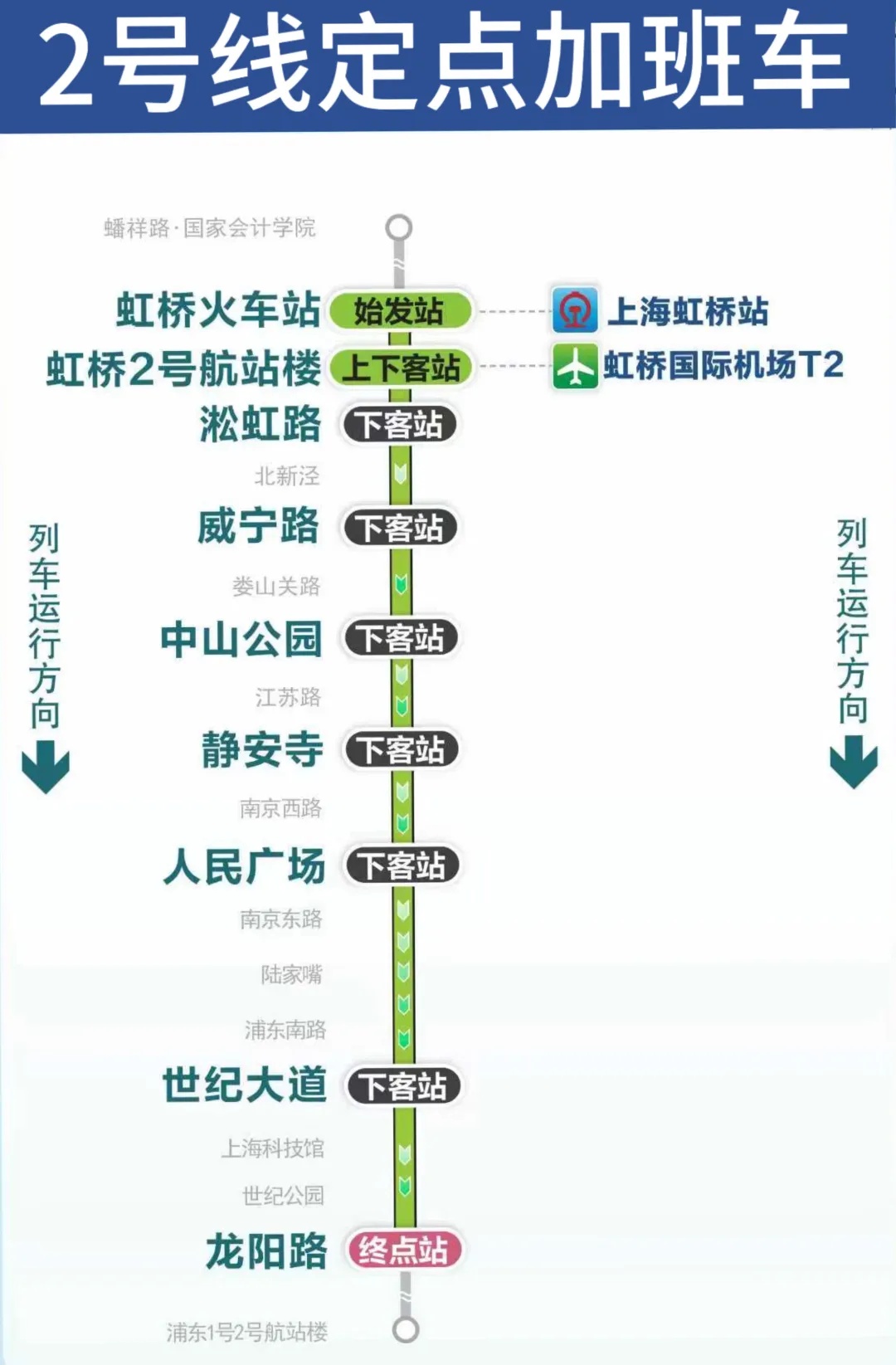 根据计划,“春运”期间,逢周日,2号线虹桥火车站站夜间定点加班车延至0点。同时,2月21日,2、9、17号线加开末班车延长至次日0点(9号线在23:00和23:20加开的列车,自佘山站起按常态延时运营实施)。2月22日、23日,1、2、9、10、17号线加开末班车延长至次日0点。