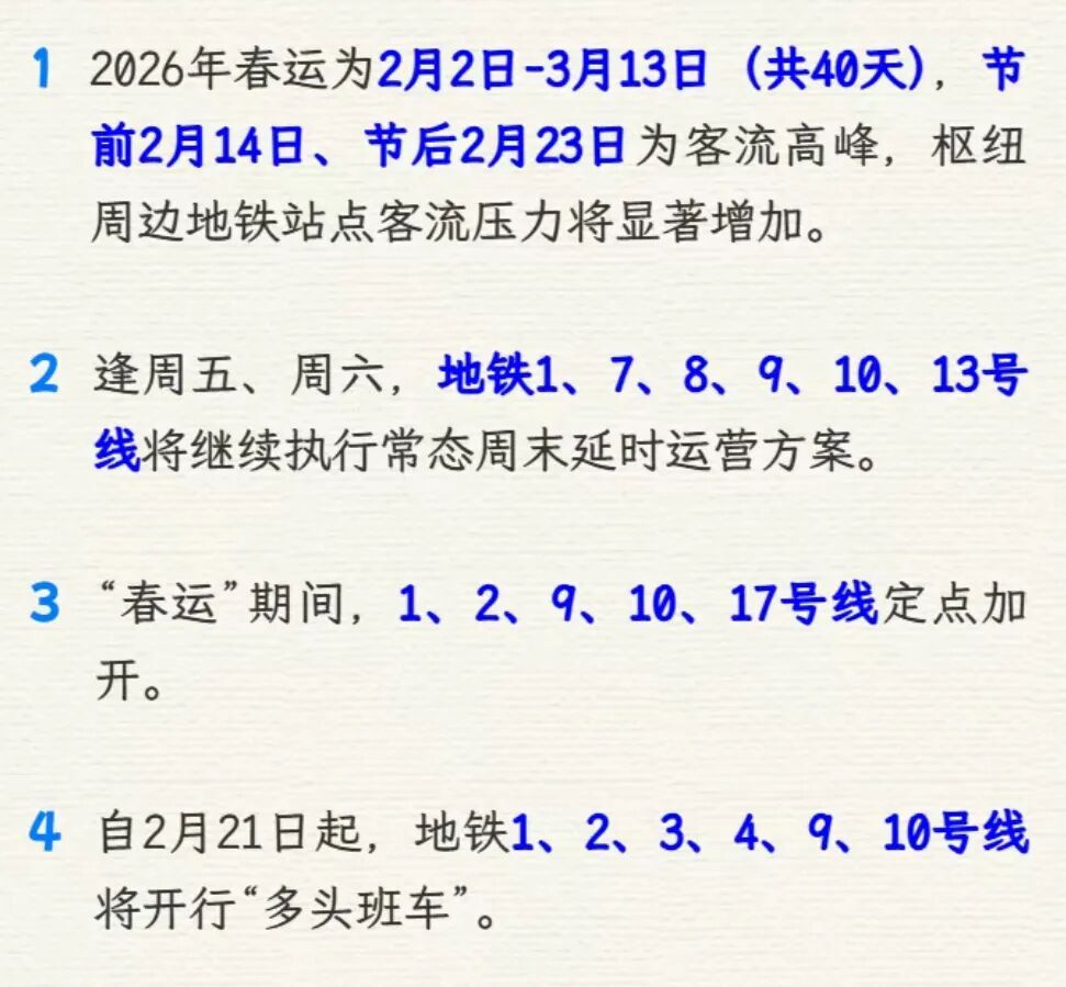 申通地铁集团介绍,2026年“春运”2月2日拉开帷幕,为期共40天。据测今年探亲流、学生流、旅游流等客流高位叠加,跨区域人员流动量将保持高位。为此,上海地铁从运力优化、现场保障、人性化服务等多方面发力,提供延时运营、多头班车、增开定点加班车等措施,全力保障市民乘客节日出行。详见↓