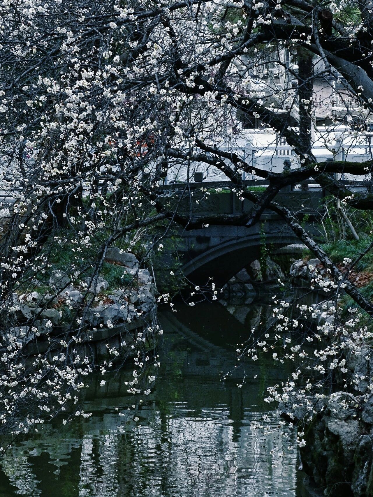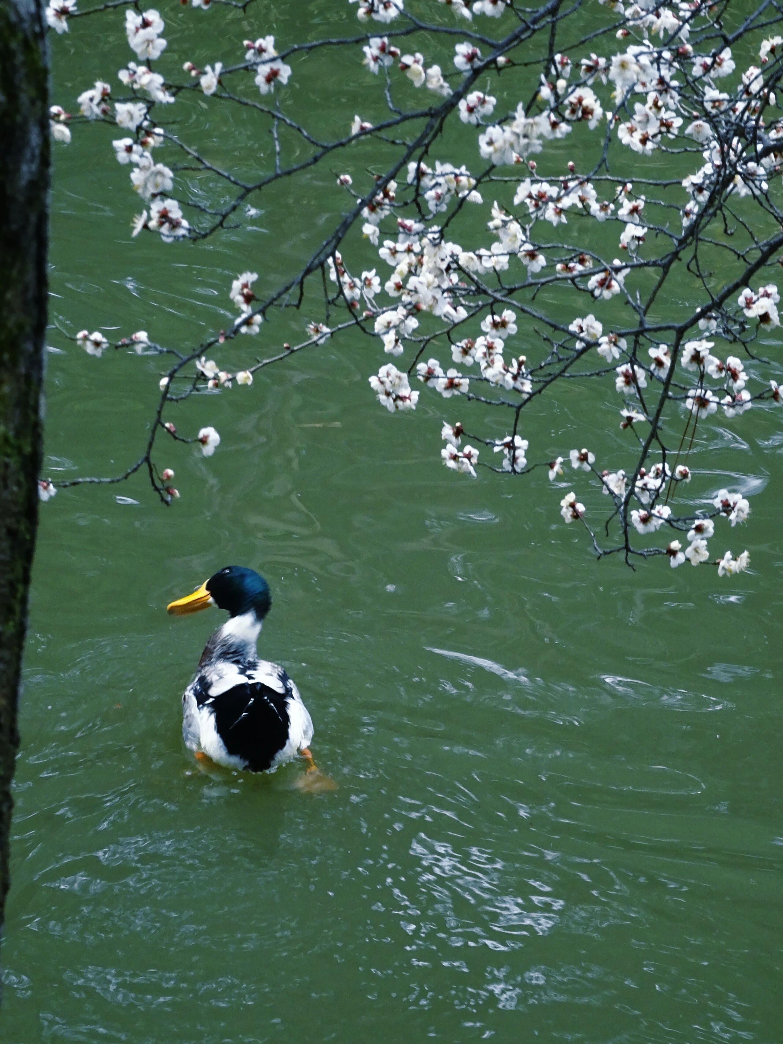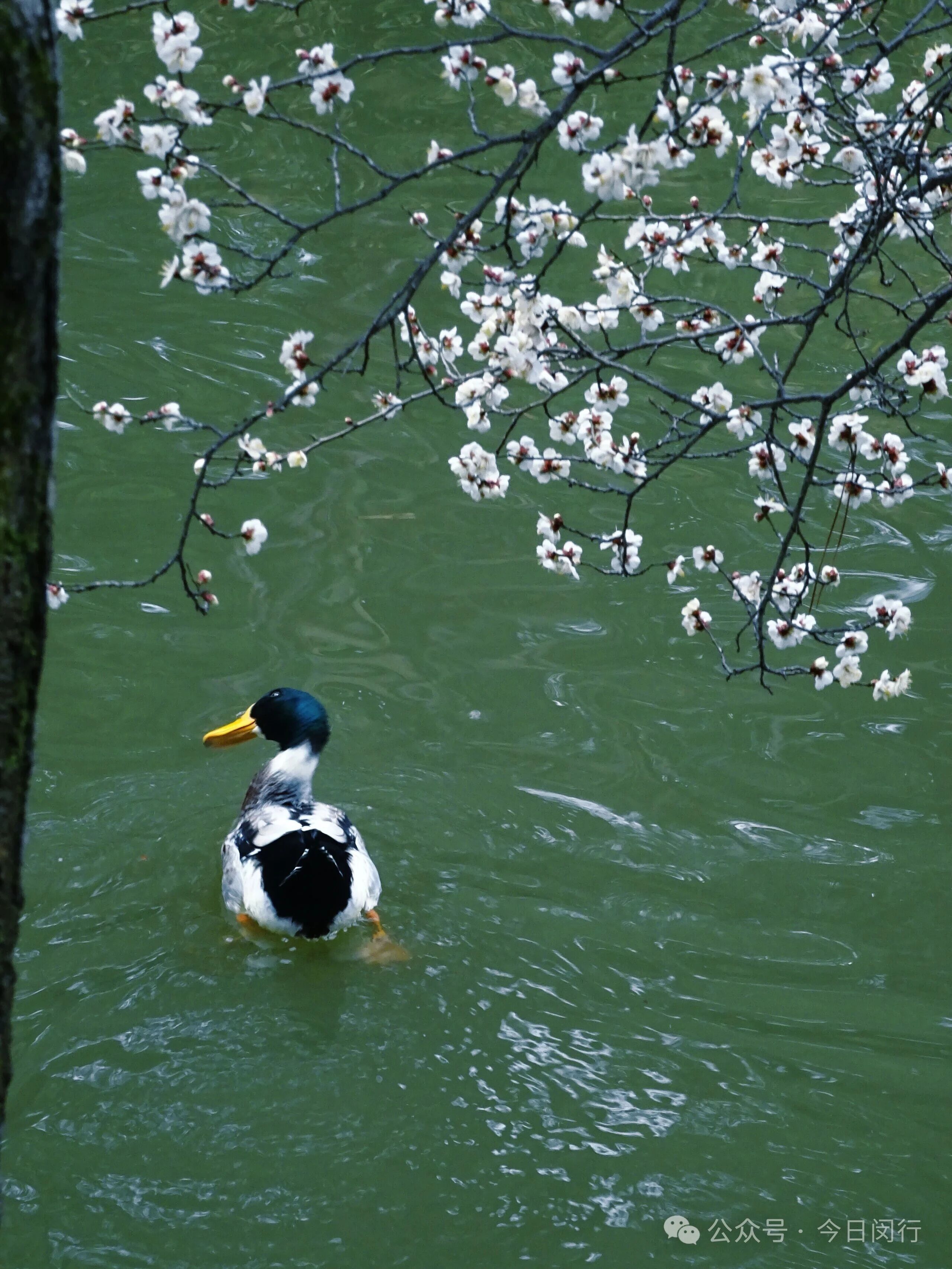 白色的梅花点缀着青绿的湖面,花影、鸭影搅在一起,分不清谁是谁。空气里有股梅花香,淡淡的,混着水汽,从湖面飘来。