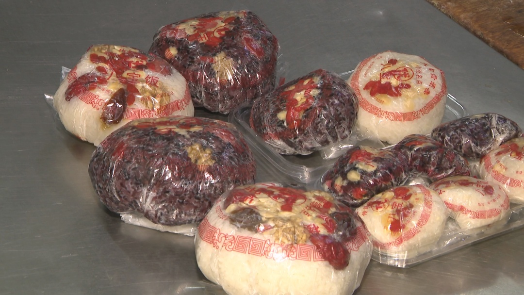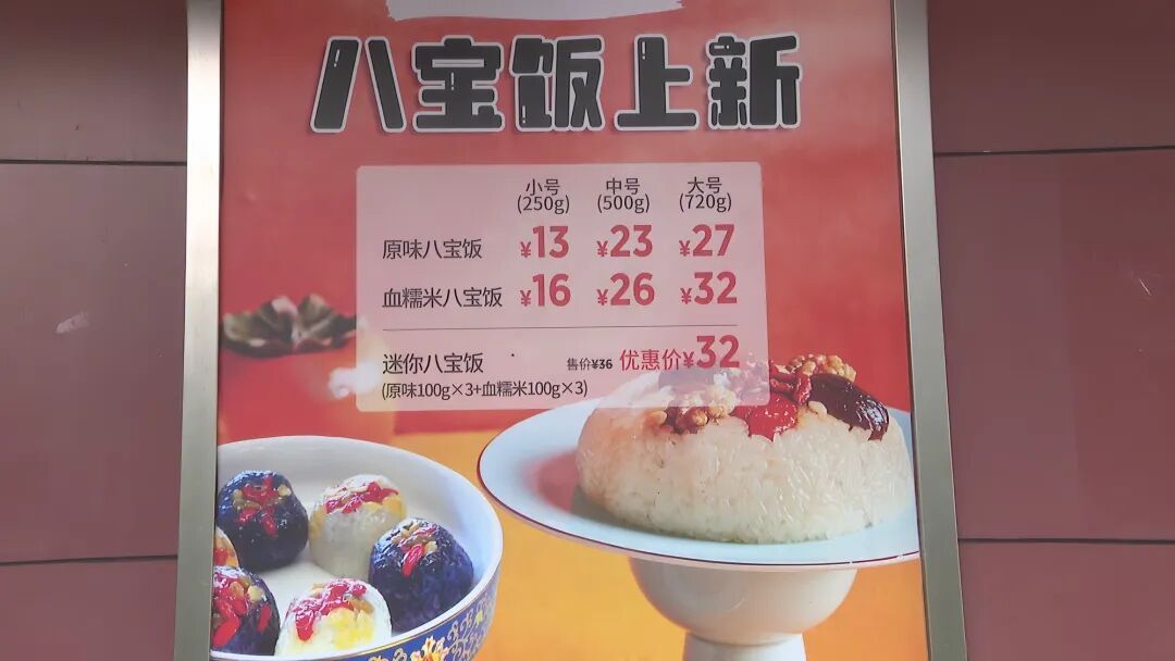大富贵的八宝饭采用传统制作工艺生产,前一天下午浸泡糯米,第二天早上做八宝饭,上午开始售卖。今年,大富贵专门推出了从大到迷你的四种类型的八宝饭,满足市场不同消费者的需求。大富贵中华路营运部经理张宜华告诉记者:“我们在八宝饭里面放了蜜饯、红枣、瓜子仁、核桃仁,还有枸杞。中间放的是豆沙馅,有红的白的两种。白的是传统的糯米,黑的是我们的血糯米做的。同时我们有四种规格,最大的在750克左右一只,中型的重量大概在500克,还有一种是小的,大概在250克。另外,我们做了一种迷你的,一只在100克左右,方便大家一顿吃掉。 ”