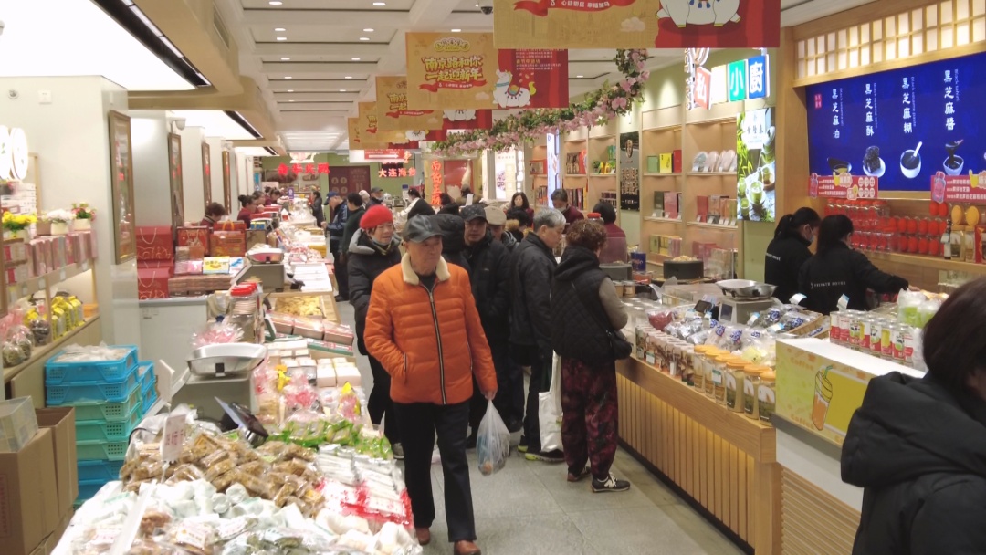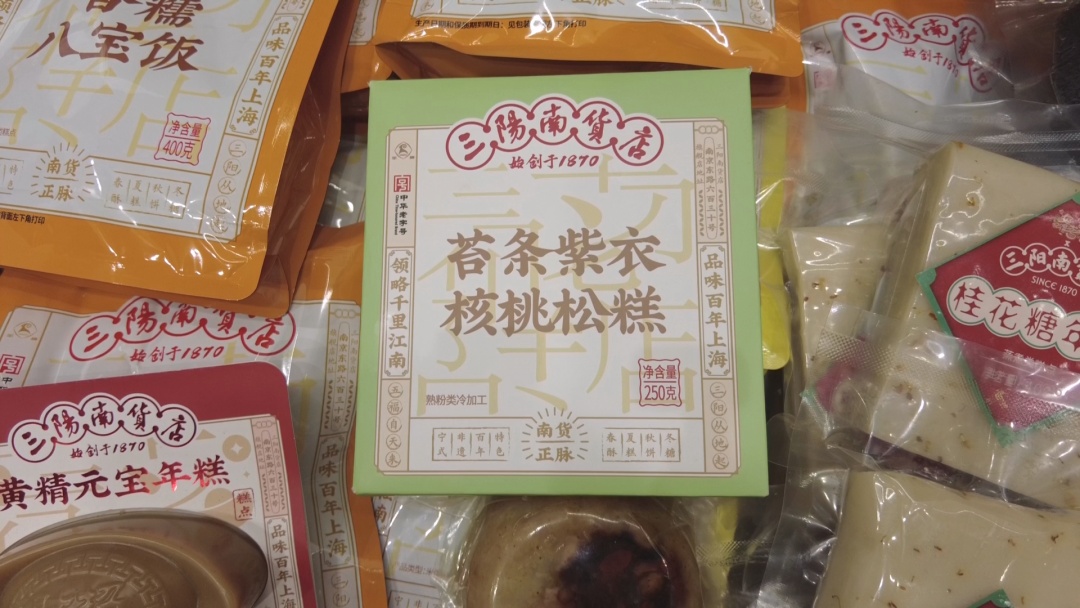 在老字号三阳南货店,春节糕点四大金刚这些天也是销售颇旺,八宝饭、松糕、糖年糕和包汤团的猪油黑洋酥摆放在进门处的醒目位置,敞开式的柜台便于消费者挑选。三阳南货店商场部经理徐晓敏告诉记者,这次根据三阳南北货特点推出的松糕,是用宁波奉化的冬苔和云南漾濞的紫衣核桃融入了松糕里面,吃口更加细腻、营养更加好。“第一口咬上去是咸的,整个口味是咸中带甜、甜中带鲜,有苔条的清香。”