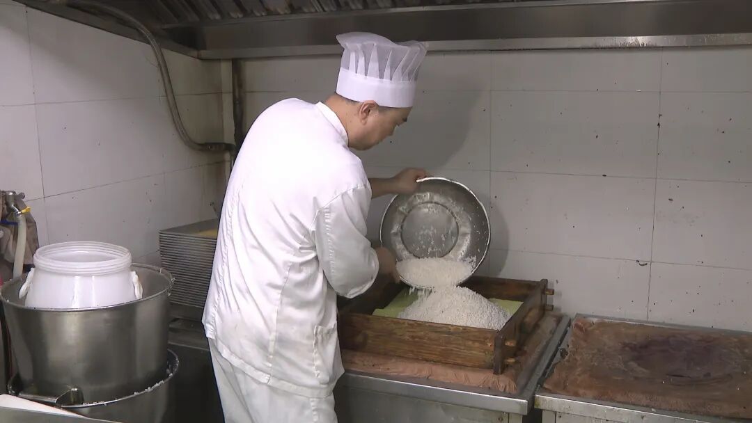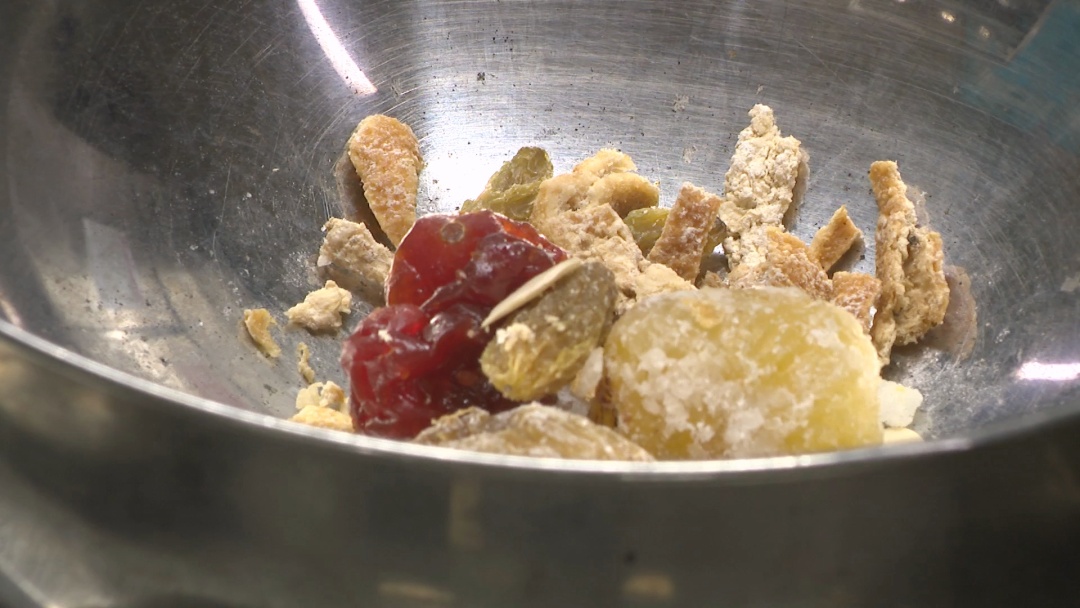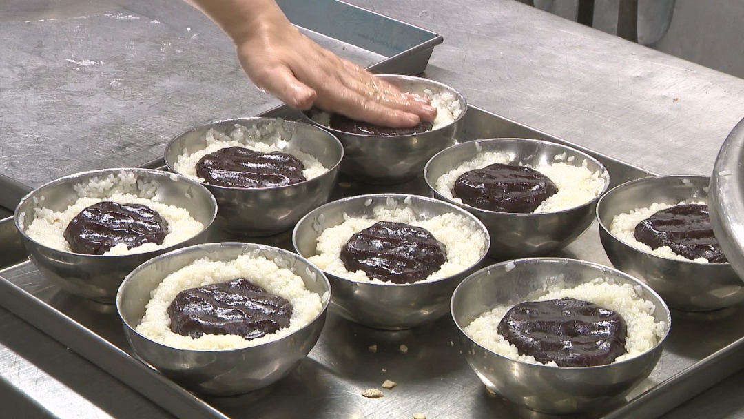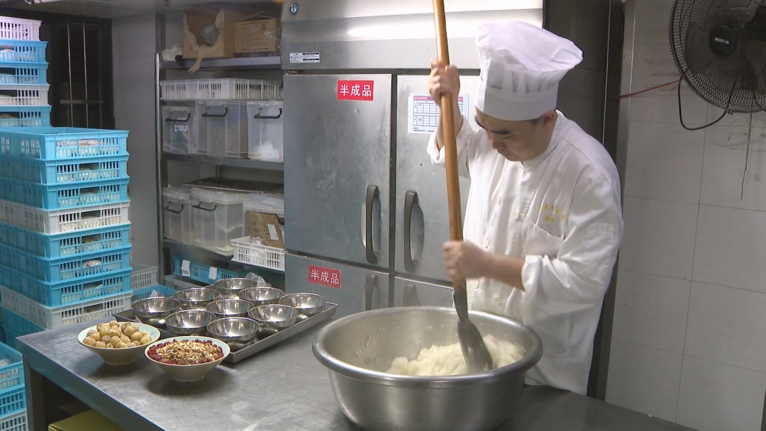 糕点生产车间一片忙碌,这些天,师傅们每天从凌晨两三点钟就开始生产各种糕点。在操作台上,上海市非遗传承人、沈大成糕团部经理沈晓龙也亲自上阵,手工制作八宝饭。沈师傅告诉记者,八宝饭的糯米一般也经过一个晚上的浸泡,到第二天才能上笼蒸。大约半个小时之后,再把蒸制好的糯米加入猪肉和砂糖进行搅拌,最后再加上蜜饯、冬瓜条、红枣等点缀辅料,中间放入沈大成自制的豆沙,最后成型后再蒸上5分钟后完成全过程。“我们每天八宝饭的销量在5000个左右,松糕在4000个左右,还有糖年糕、条头糕等都是大家比较喜欢的。”