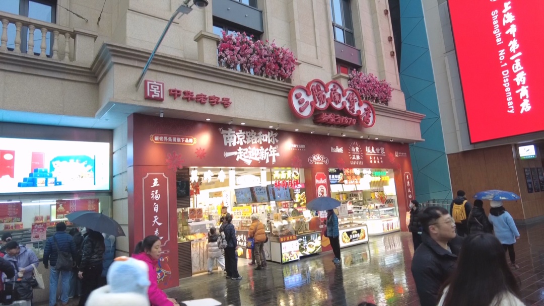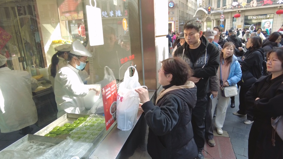 在南京路步行街上的老字号沈大成,各大外卖糕团窗口齐开,每个窗口前都排满了等候的队伍,不少市民游客都以一下子买了好几样,糍毛团、还有双酿团等都是点击率非常高的品种,尤其是八宝饭和松糕,不少消费者是特意赶来购买。