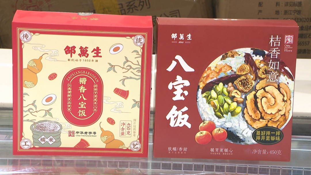 南京路步行街上的老字号邵万生今年推出的“桔香如意”八宝饭也是别具风味,受到消费者青睐。邵万生的八宝饭与传统相比,这次的新品是没有豆沙之类的馅芯,全部采用乌米和糯米,再加上各种干果点缀,满足了“糯米控”的需求。邵万生南东店糟醉柜台组长吴寅秋告诉记者,八宝饭在蒸完之后可以经过充分搅拌,使八宝饭的果香味、桔香味和糯米香味三香结合,“满足那些喜欢吃糯米口感的消费者”。一位正在购买八宝饭的市民告诉记者:“我特别喜欢吃乌米和糯米,特别是乌米是江南的特色。八宝饭还配上了很多干果之类的食材,很过瘾。最重要的是它里面没有豆沙,含糖也比较低,比较适合与老年人一起吃。”