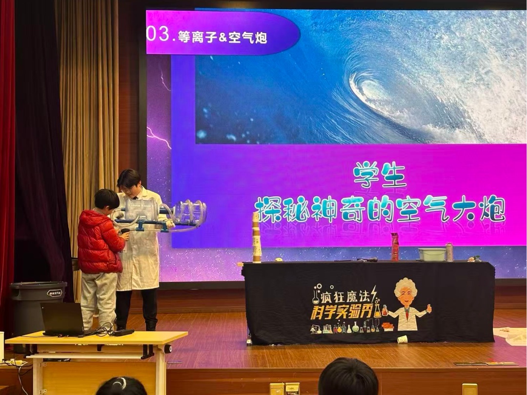 开班第一天,区科协特别为孩子们带来了一场沉浸式的科学魔法之旅:从见证玫瑰在液氮中瞬间变得如薯片般酥脆,到品尝冒着白雾、入口冰爽的“爆米花”;从观摩温水与液氮相遇时腾起蘑菇云般的奇幻白雾,到体验空气炮隔空击倒纸杯的“无形之力”——每一个环节都伴随着孩子们的惊叹与欢呼。最后,老师手中安全燃起又瞬间熄灭的火焰,将现场氛围推向高潮。整场活动不仅充满趣味与互动,更在孩子们心中悄然播下了好奇与探索的种子。