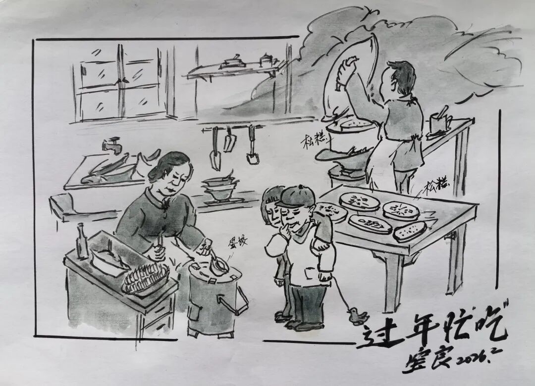 开心在家过年的前头,大家就是忙了吃。平时没空也没什么好吃的,过年嘛,亲戚、朋友要来走走,弄点吃吃总要忙点。不像现在都上酒店,平常要想吃啥都有,随时好买。虽说忙点,也蛮开心。侬看小朋友都是“馋唠坯”,眼睛盯着“摊蛋饺”,已经忍不住嗦手指啦。