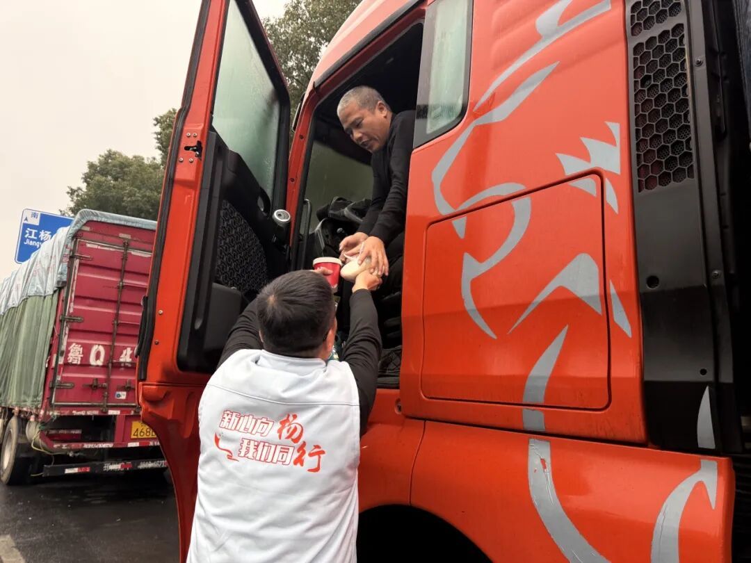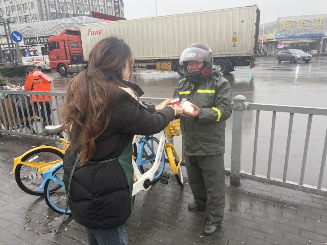 站长陶佳伟一接到物资,就带着工作人员冒着雨送到市场货车司机、快递员手中,寒风裹挟微雨,温暖却洋溢在一张张笑脸上。