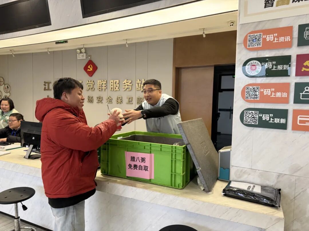 除了送上保暖物资,有关市场里的点滴暖心小事也一直在持续。前不久的腊八节一早,在区、镇总工会的关心下,由爱心企业捐赠的热乎腊八粥和暖暖的包子送达江杨市场党群站。