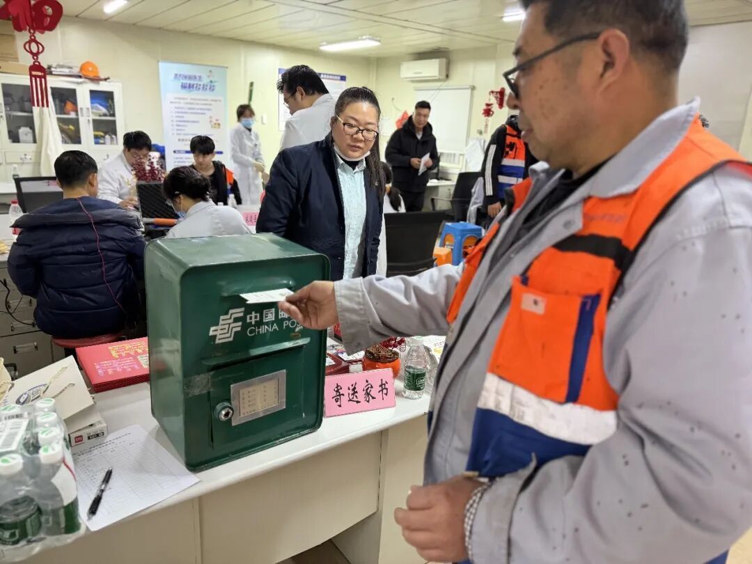 北外滩邮政支局设置的“寄送家书”服务点前同样热闹,工友们伏案书写,将对家人的牵挂和工地上的温暖一同装入信封,寄往远方亲人手中。此外,厦门国际银行上海分行的工作人员还开展反诈金融宣传,通过典型案例讲解,帮助工友们提高防范意识,守住辛苦一年的劳动成果。