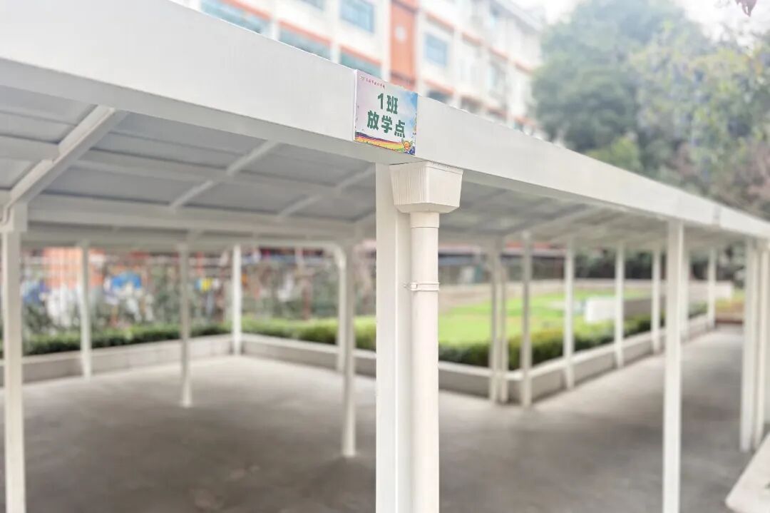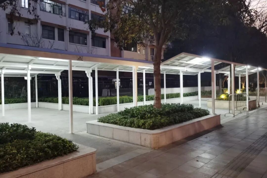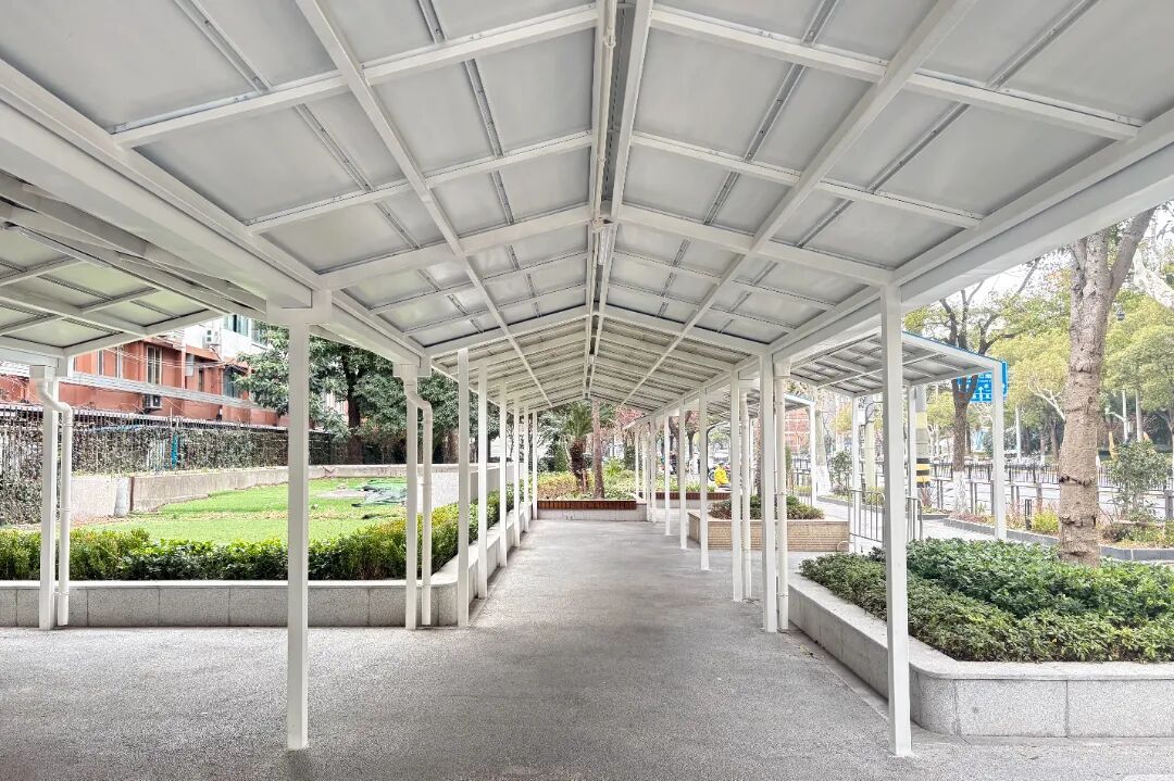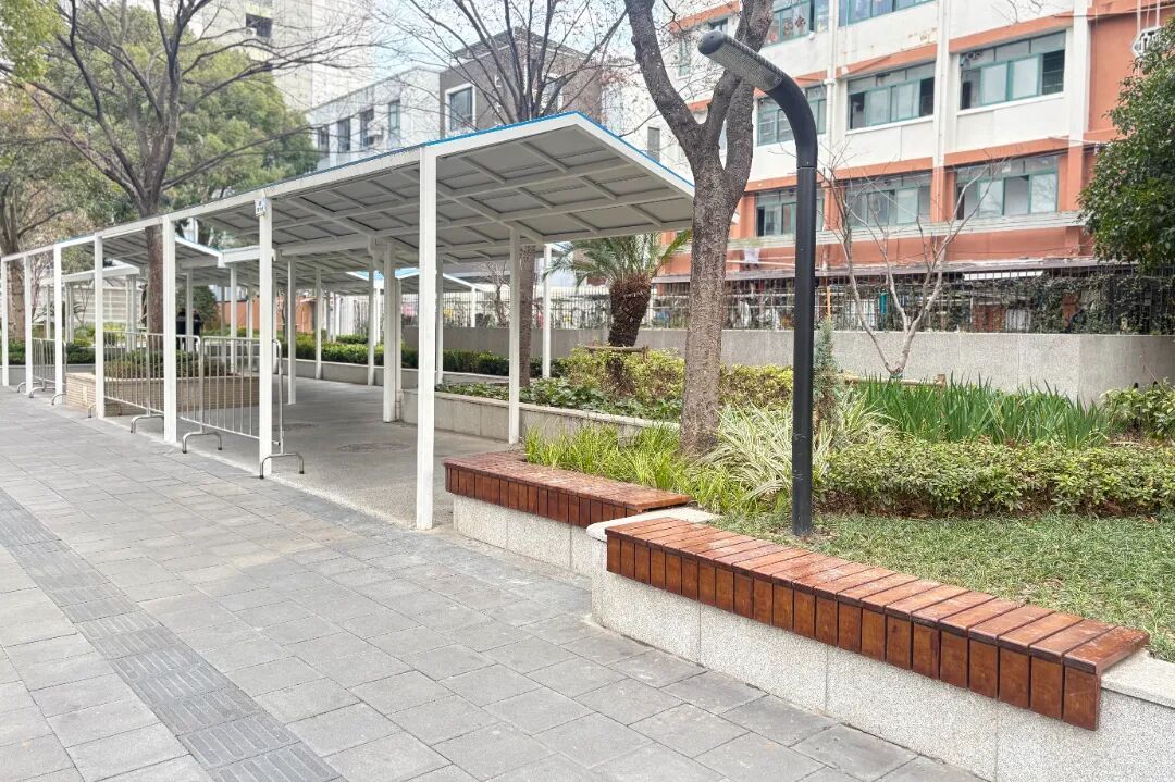 上海市北郊学校门口的绿地改造,精准回应了家长和居民的需求痛点。原本局促的接送区如今宽敞明亮,整排钢结构雨棚取代了零散帆布棚,不仅更加美观坚固,还加装了照明设施,为傍晚接送孩子的家长照亮等候之路。