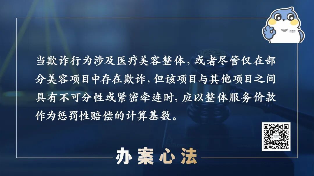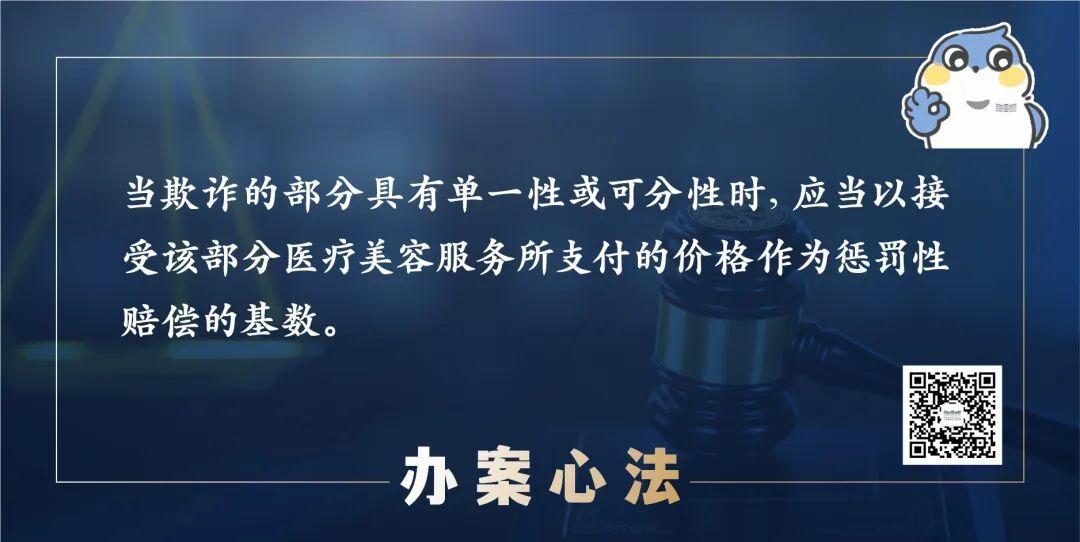 当欺诈行为涉及医疗美容整体,或者尽管仅在部分美容项目中存在欺诈,但该项目与其他项目之间具有不可分性或紧密牵连时,应以整体服务价款作为惩罚性赔偿的计算基数。例如,在上述杨某与成都某医美公司服务合同纠纷案中,法院认为,双方合意是接受隆鼻整体塑形服务。虽然手术项目包括“鼻中隔延长术”“鼻小柱延长术”“鼻尖再造术”等,但成都某医美公司对杨某实施的手术是对膨体与自身肋软骨雕刻缝合,从而形成完整鼻部的医疗美容服务,杨某不能也没有必要单独购买膨体;杨某的支付凭证也能证实其接受的是鼻部医疗美容,不应将三个手术项目割裂计算。可见,如果消费者购买的商品或者服务是一个不可分割的整体,而存在欺诈的商品或者服务不能独立于整体且属于核心关键部分,则经营者应当按照整体商品或者服务的价格为基数而非按照存在欺诈部分的商品或者服务的价格为基数承担惩罚性赔偿责任。
