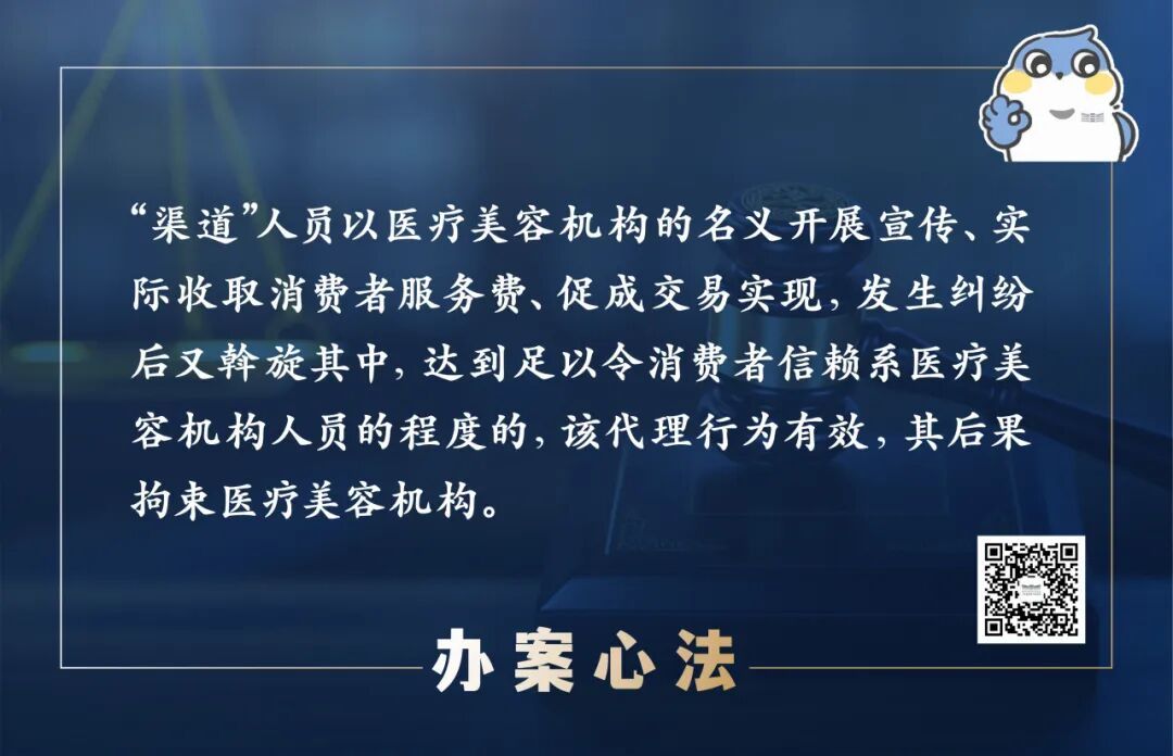 当前医疗美容行业中,广泛存在“渠道”人员,通过推介医疗美容服务而取得返现,甚至获得“定价权”而获取大部分医疗美容服务费,当纠纷发生时,却因系个人而脱逃于法律关系之外,亟待法律规制。民事代理分为有权代理与无权代理。在有权代理的情况下,自然对被代理人产生拘束力。而即使是无权代理,在特定情况下,因其符合表见代理的特征,从而仍然产生有权代理的法律效果。如果该第三人虽非医疗美容机构的相关负责人、一般职员、医护人员,而系“渠道”人员,但在推介业务时以医疗美容机构的名义开展宣传活动,实际收取消费者服务费,促成交易实现,发生纠纷后又斡旋其中,达到足以令消费者信赖系医疗美容机构人员的程度,则该代理行为仍然有效,其后果拘束医疗美容机构。特别是当消费者是善意且无过失时,如强令代理行为无效,置善意相对人的利益于不顾,势必影响交易安全。要求相对人在任何情况下都必须详细考察被代理人的真正意思,不仅要花费很大的交易成本,实际中也很难做到。因此,只要相对人对行为人有代理权形成了合理的信赖,即使实际情况相反,也应该保护这种信赖利益,在一定程度上牺牲被代理人的利益,将无权代理的效果归属于被代理人,以维护交易安全。