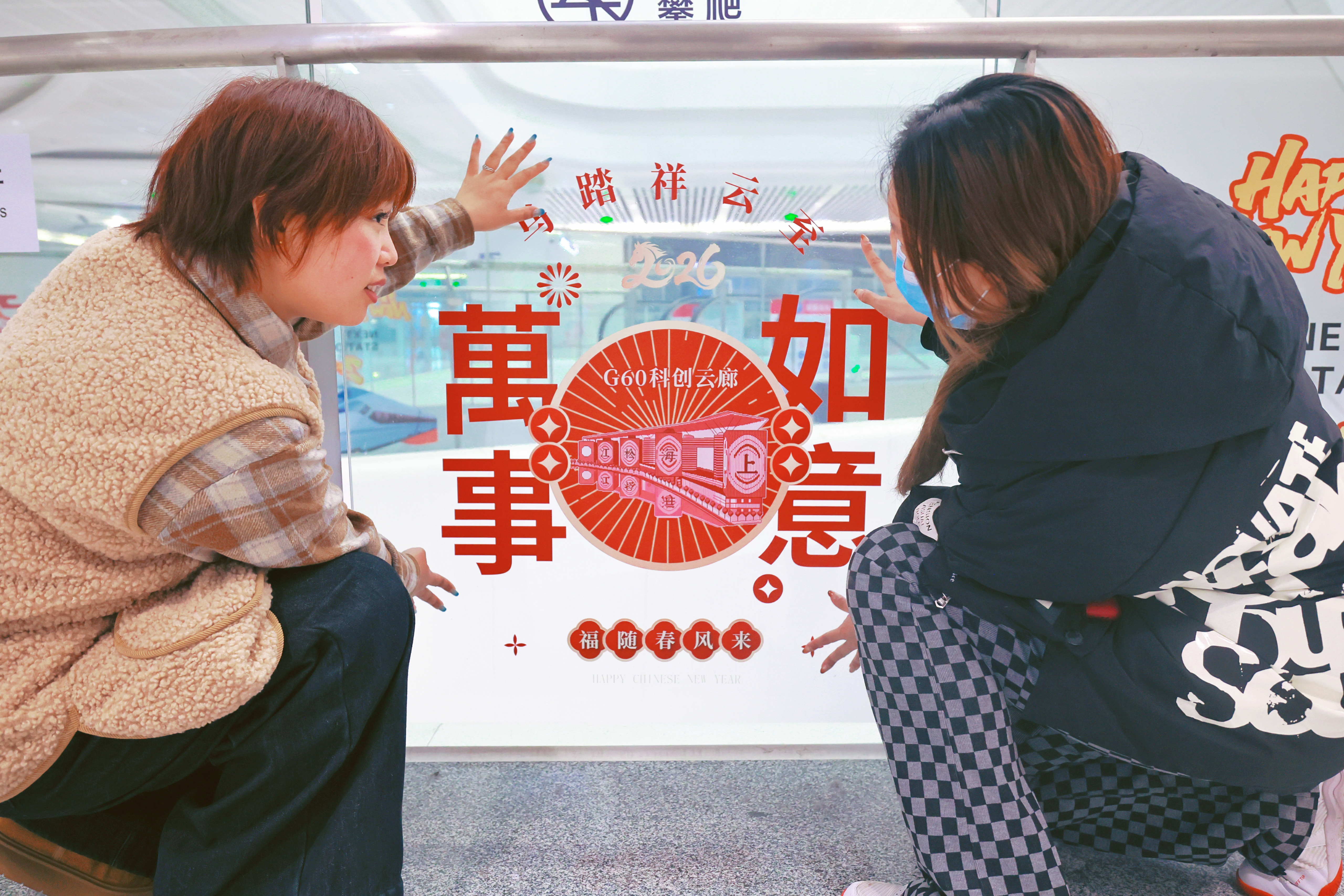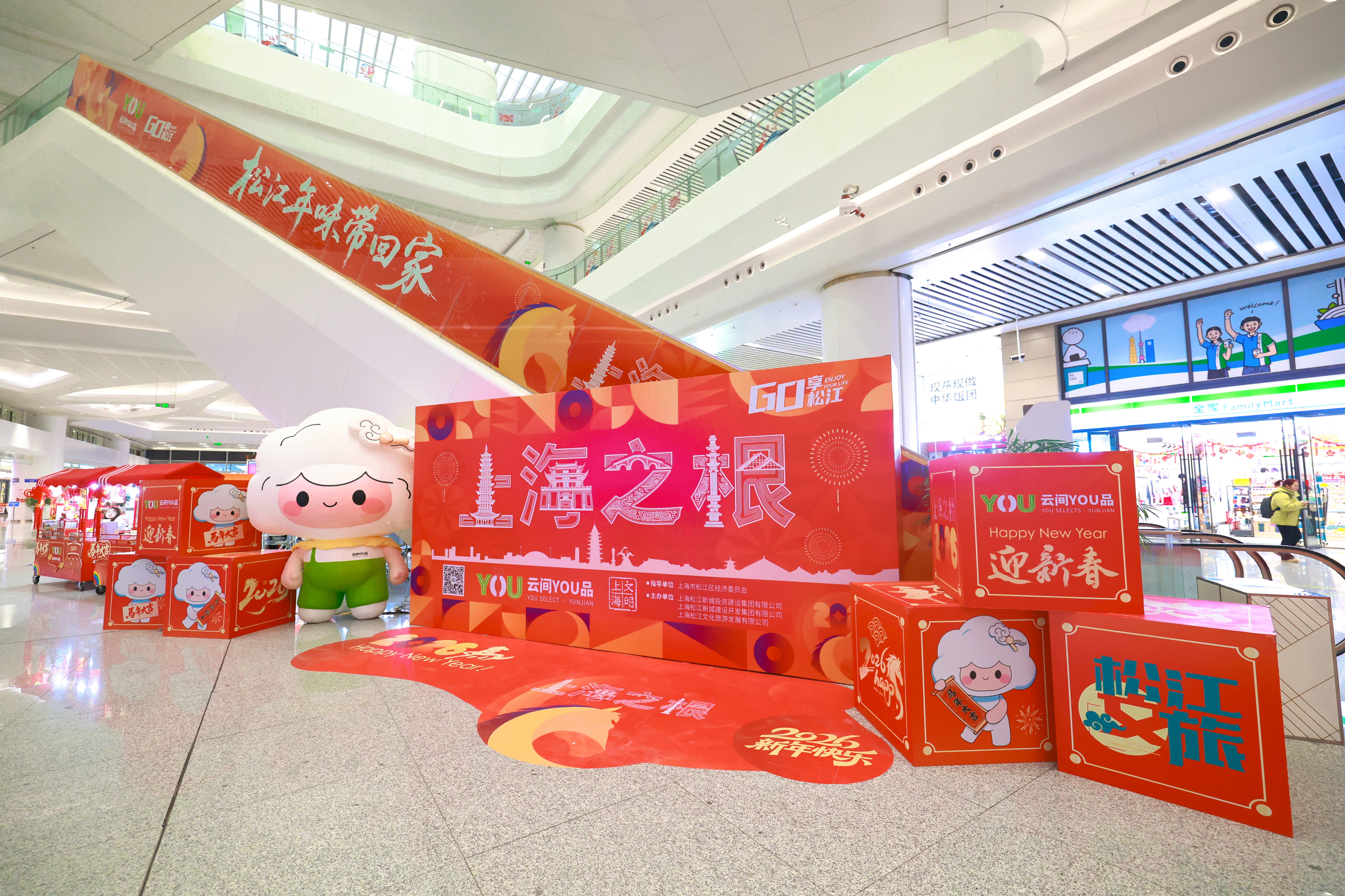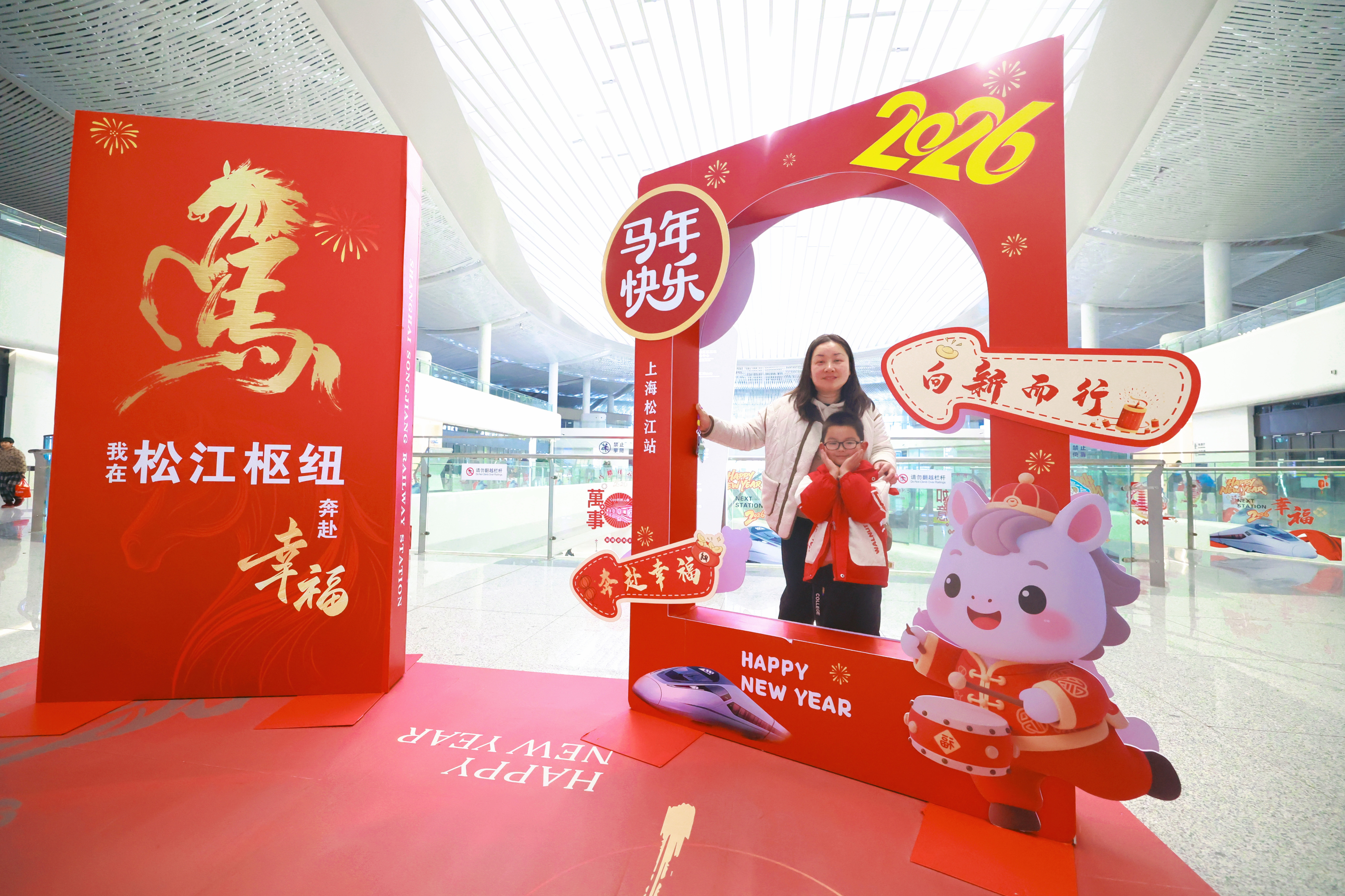 2月9日,上海松江站站内年味浓郁。马年主题装饰、红灯笼与“上海之根”特色布景错落摆放,工作人员正细致完善新春装饰。不少旅客驻足在“2026马年快乐”“万事如意”布景前合影留念,喜庆氛围弥漫候车大厅,让春运返乡之路充满温暖的年味。 记者 蔡斌 摄