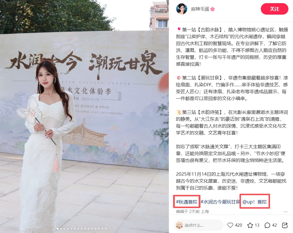话 题 参与方式 双平台创作 整个活动将在微信视频号及小红书平台展开 以#半马苏河四季光影作为核心主话题 微信视频号参与>>> ①进入“半马苏河四季光影” 官方话题页 扫码二维码进入话题页 ②点击“参与”,发布与普陀相关视频 ③发布带话题 文案带上#半马苏河四季光影+当季子话题(如春节话题#普陀年味“马”上寻),并@上海普陀官方账号,即成功参与。 小红书参与 >>> 发布作品时添加#半马苏河四季光影#+当季子话题,同时@up! 普陀官方账号,即可同步参与,让你的创作获得双平台曝光。