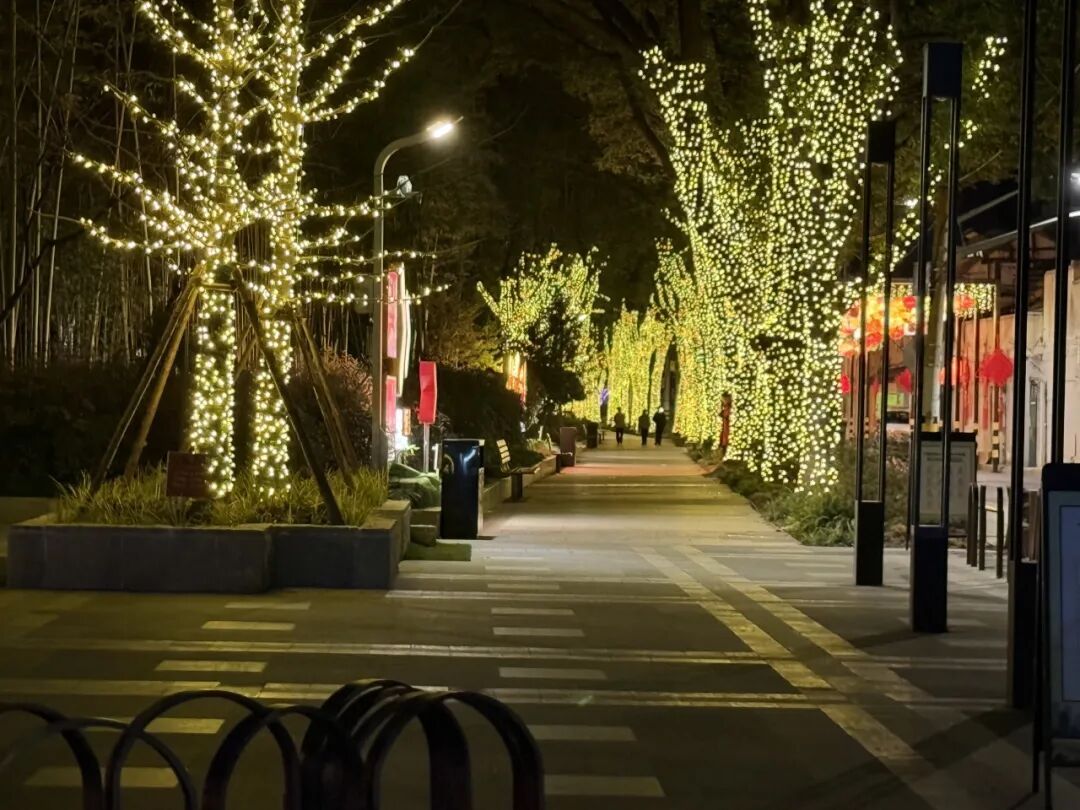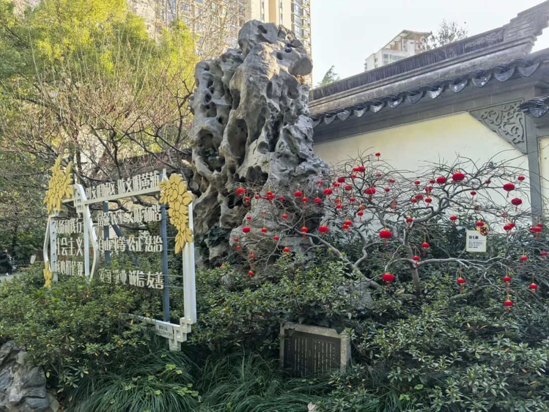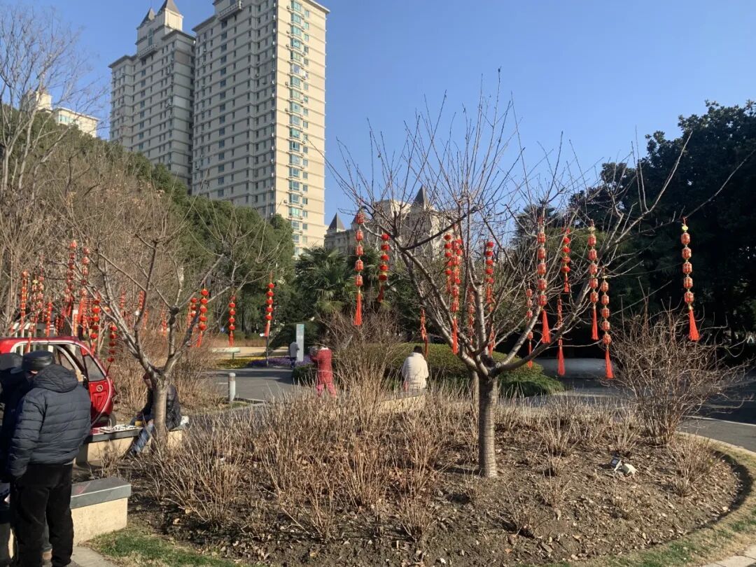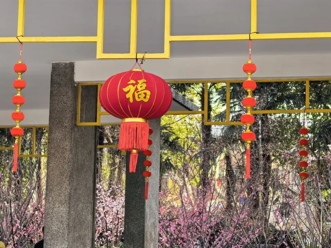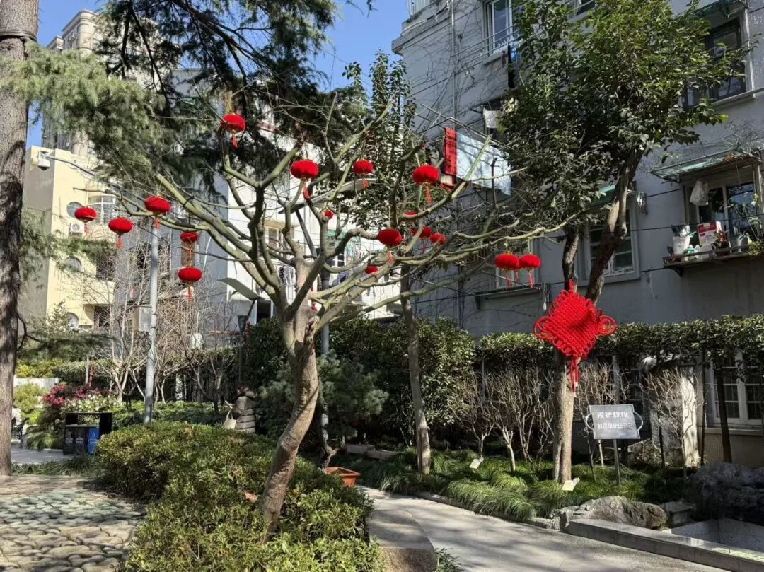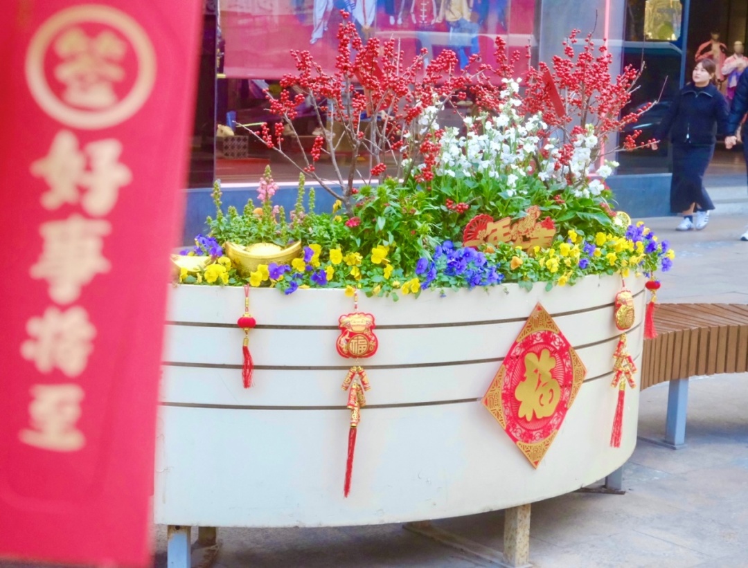此外,公共绿地及道路花箱也精心悬挂了大红灯笼、张贴喜庆春联,各式传统装饰错落有致、摇曳生姿,既勾勒出浓郁的传统年味。