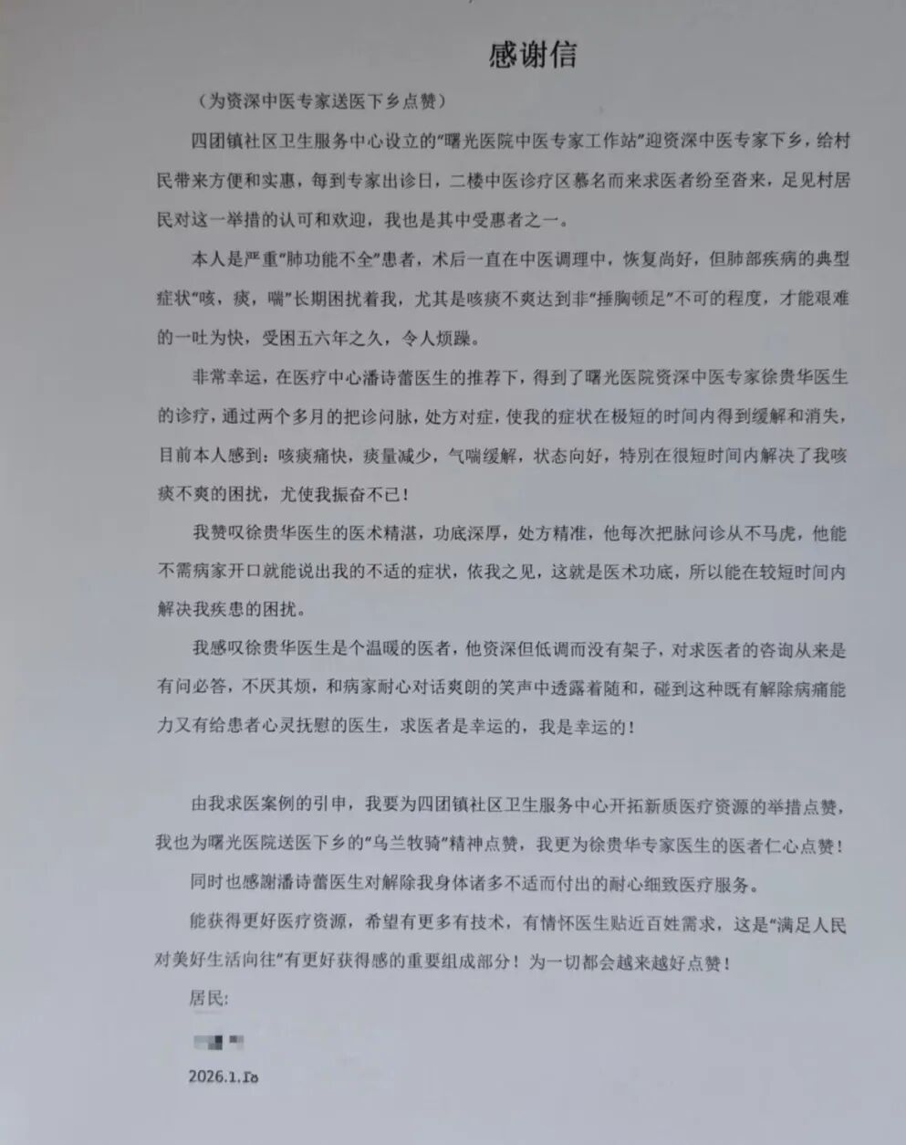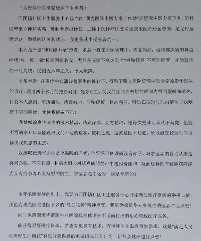 “在家门口就能享受到三甲医院专家的诊疗,真是太幸福了!” 康复后的余老伯满心感激,不仅写下感谢信,还主动预约徐主任下次出诊,想为同样受咳喘问题困扰的老伴加号求诊,希望将这份 “健康福利” 与家人共享。