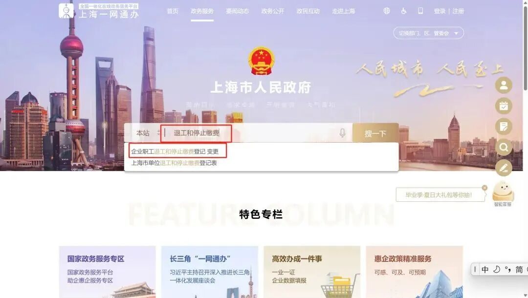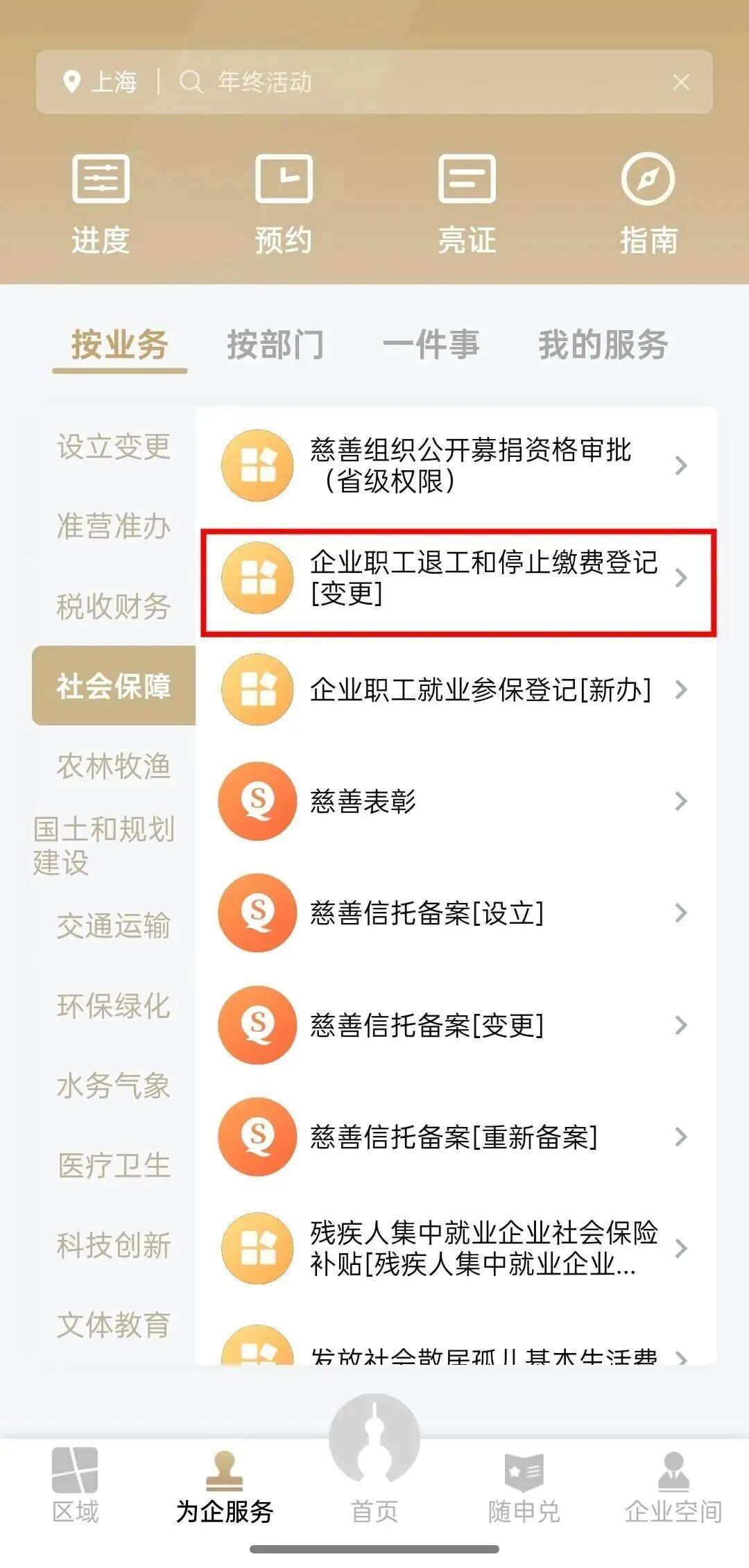 在企业的日常运营中,碰到员工离职时,你知道退工和社保停止缴费该如何正确操作吗?要是处理不当,不仅会给企业带来法律风险,还可能损害员工的切身利益。跟着我们,一键掌握退工和停止缴费的正确操作! Q 您好,我们单位有人离职了,之前入职做了就业参保登记,现在离职需要办理什么业务呢? 您可以通过“企业职工退工和停止缴费登记”一键办理职工的退工和社保停缴。 A Q “企业职工退工和停止缴费登记”在哪里能办呢? 办理“企业职工退工和停止缴费登记”既可以电脑办,也可以掌上办,让我们一起来看一下分别如何办理吧! A 渠道一 通过“上海一网通办”平台,以企业身份通过“法人一证通”或者“电子营业执照”登录后直接在搜索界面搜索“企业职工退工和停止缴费登记”,点击对应功能后的立即办理,便可到达“企业职工退工和停止缴费登记”页面。 一网通办页面点击登录 法人登录页面使用电子营业执照或者法人一证通登录 在首页搜索“退工和停止缴费” 点击立即办理,进入后页面与渠道二页面相同 渠道二 登录“上海市人力资源和社会保障自助经办系统” (https://zzjb.rsj.sh.gov.cn) 进入“社会保险—就业参保—企业职工退工和停止缴费登记”栏目进行操作。 搜索栏搜索退工可以更快找到 进入页面后,填写证件号码点击查询,信息确认栏红框项将变为可选,按实际选择退工原因和日期即可 渠道三 “随申办企业云”APP,企业用户登录后,点击“为企服务”,在“社会保障”栏目点击“企业职工退工和停止缴费登记[变更]”。 左右滑动查看更多 依次按照以下步骤进行操作: 1. 填写对应员工的身份证号及姓名点击“确认” 2. 正确选择解除或终止劳动合同日期 3. 正确选择退工原因 4. 点击提交完成退工和停止缴费