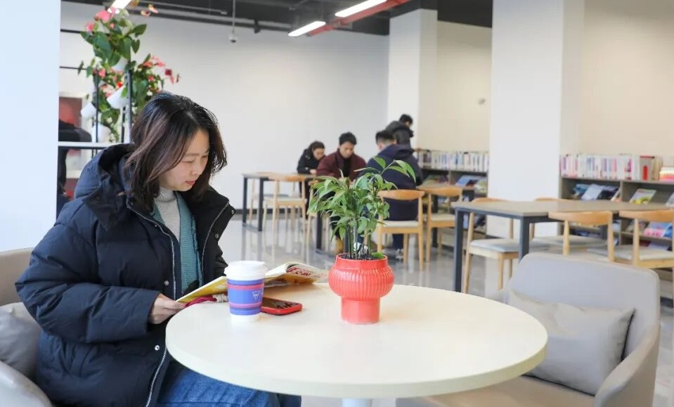 2月6日,在嘉住·城际铁社区(嘉岸名庭)的我嘉书房内,青年人才小张正翻阅着馆内刊物。这里距离她的住所步行只需10分钟,距离她上班的公司仅5公里车程。