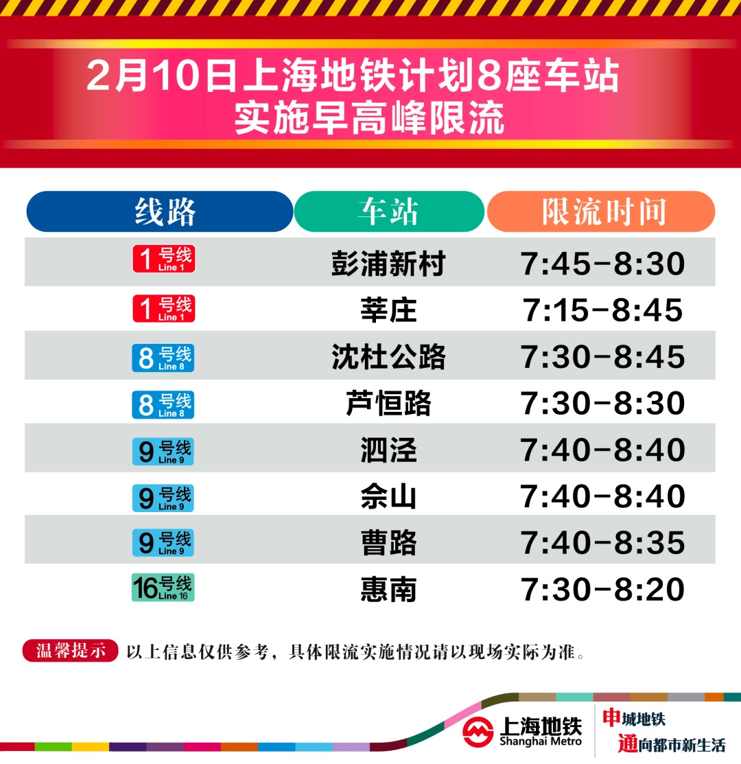 2月10日早高峰泗泾、惠南等8座地铁站计划限流