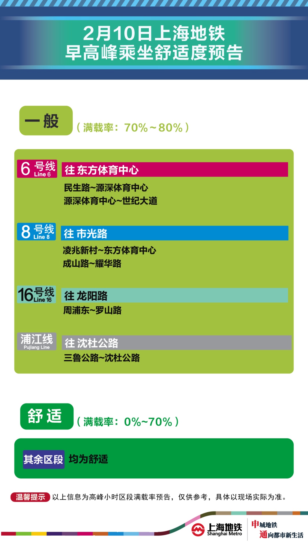为提升上海地铁早高峰期间出行服务水平,提升乘客乘坐体验,上海地铁向乘客提供乘坐舒适度预告,方便乘客提
