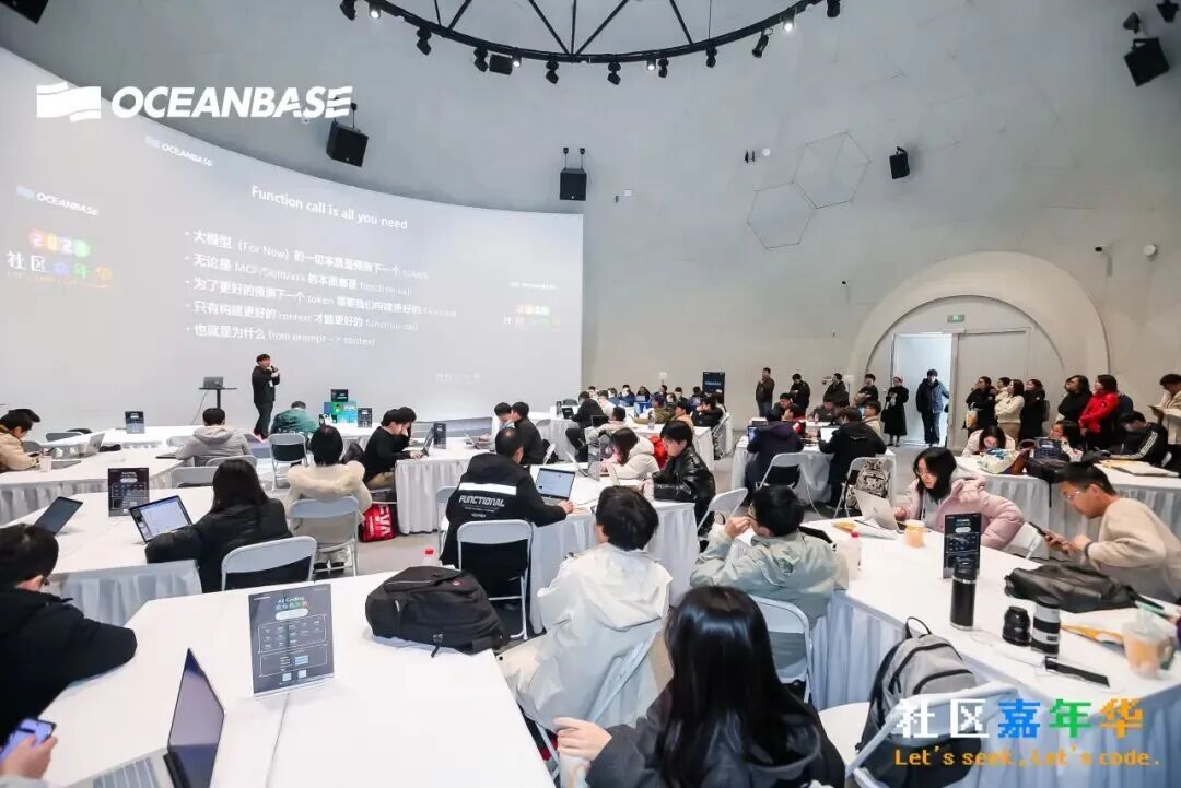 本次活动创新设立了AI Coding实战环节。OceanBase Ambassador伊洪以“开源,Agents以及AI Coding”为主题,进行了分享,并在现场零代码“手搓”coding agent。