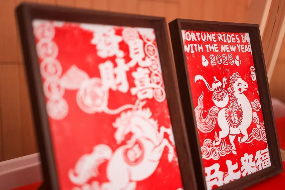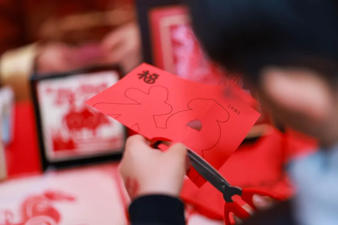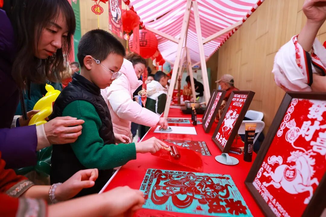 一旁的民俗体验区更是热闹非凡,设有非遗拓印、剪纸、中国结艺、绒花制作、彩绘、书法等八项互动项目。无论大人孩子,都兴致勃勃动手尝试——在剪纸镂空间剪出吉祥图案,于笔墨挥洒间写下新春福字,借丝线缠绕编织美好祝愿。指尖流转的是技艺,心中感悟的是传承,脸上洋溢的是笑容,邻里温情在共同体验中悄然升华。