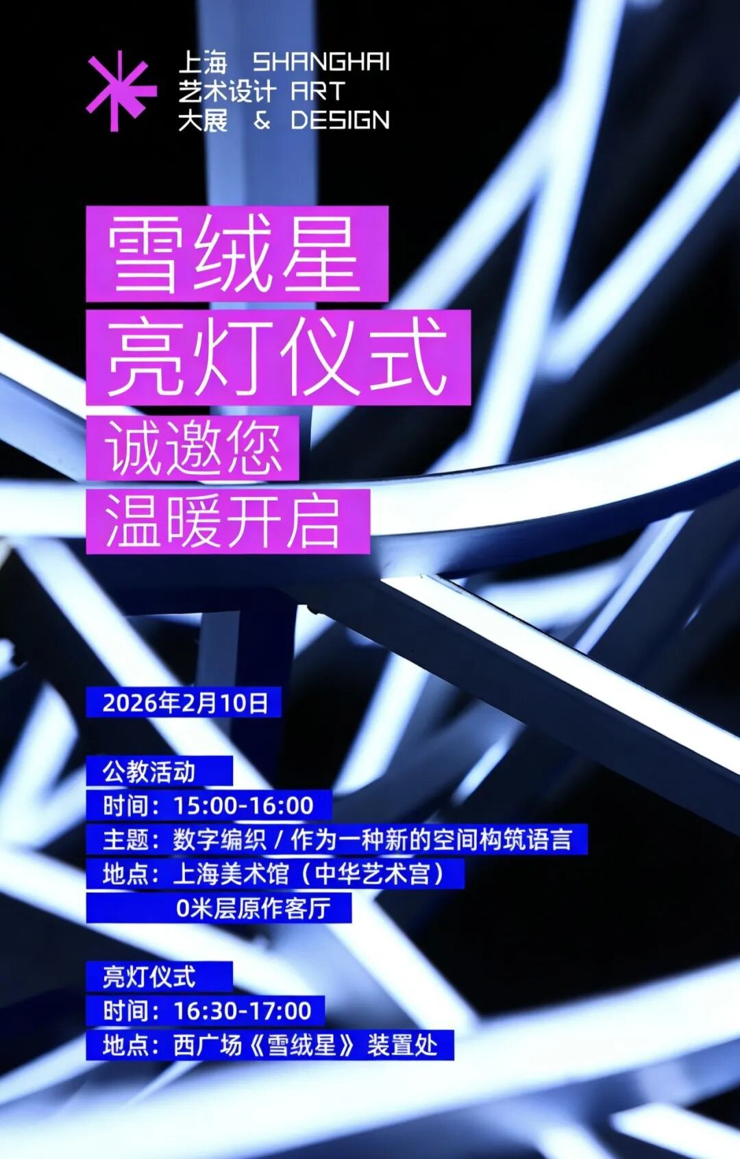 分享结束后,我们还将共同迎来激动人心的时刻——作品《雪绒星》亮灯仪式。所有参与者将共同倒数,亲手点亮这颗“冰雪之星”。