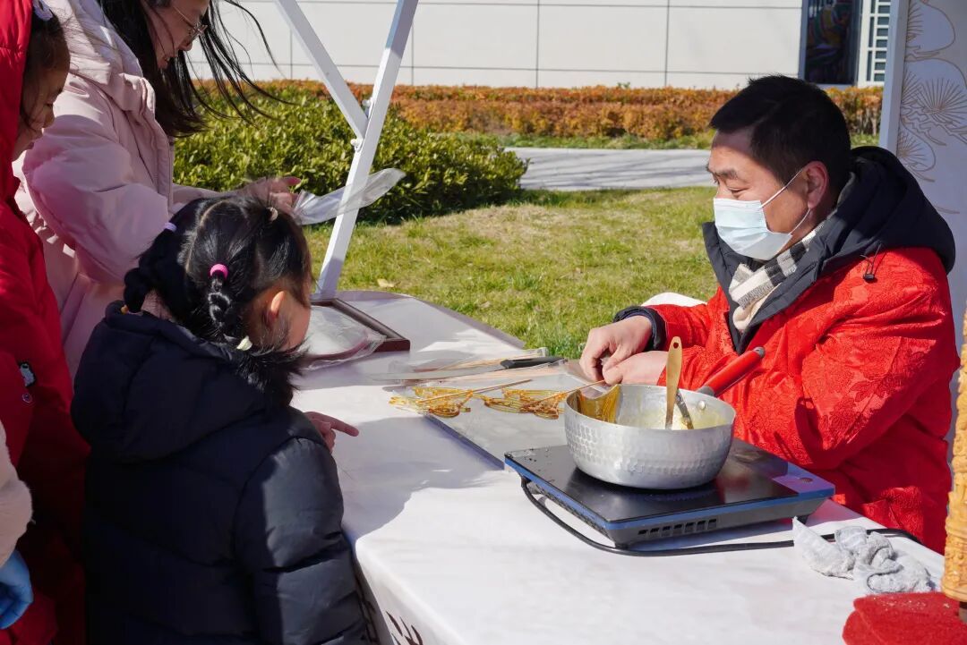白先生一家来自吉林,他的孩子刚拿到一个“马丫丫”造型的糖画,开心地手舞足蹈。白先生表示:“这糖画让我想起老家过年,但师傅把马桥自己的形象做进去,又新鲜又亲切,真是巧思!”