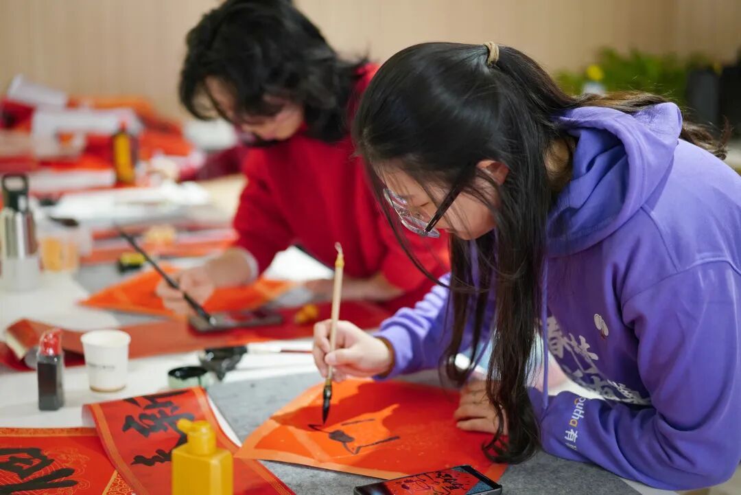 在“马鸭技能”体验区,居民们沉浸在丰富多彩的民俗活动中。有巢书法团队在现场为居民写春联、送福字,居民亲手蘸墨拓印带有“福”字的门贴。现场还有剪纸老师指导居民剪出形态各异的窗花。小朋友们则偏爱在挖掘盲盒中探寻“宝藏”。