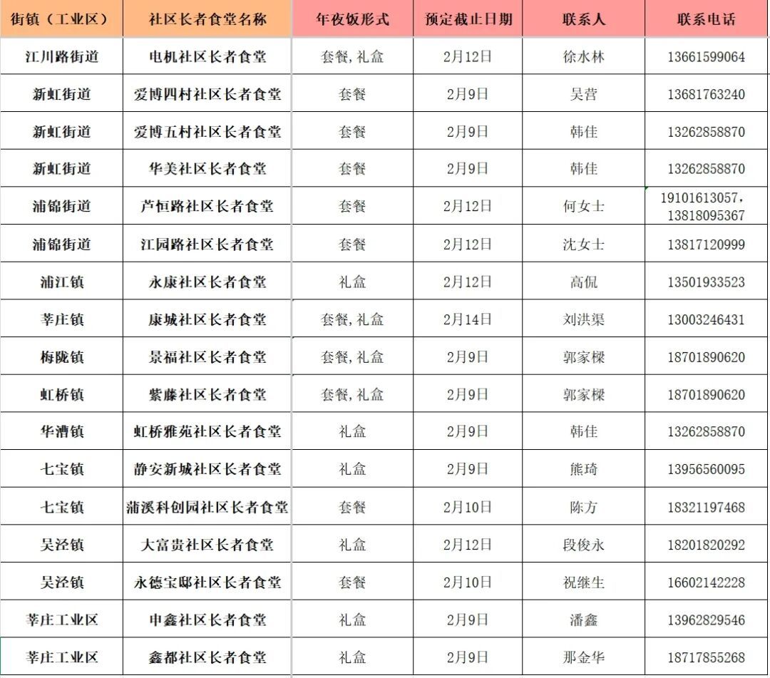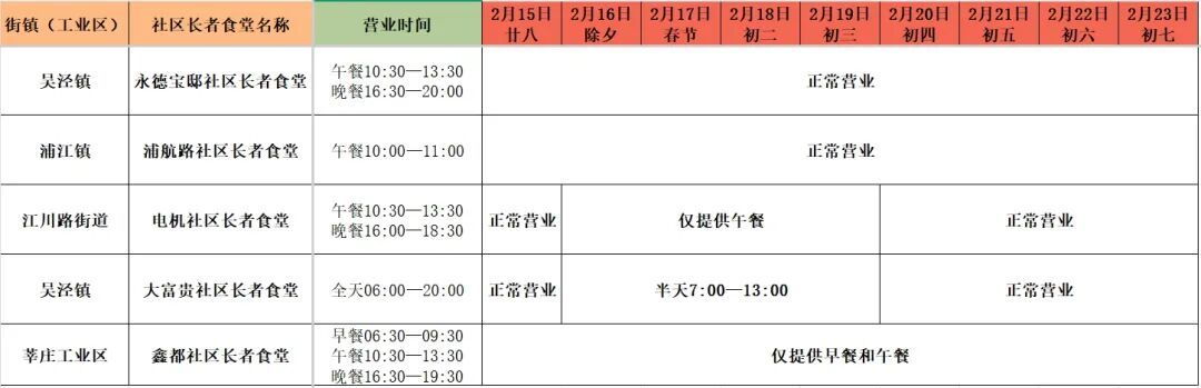 3家社区长者食堂调整供餐时间,分别是莘庄工业区鑫都社区长者食堂(鑫都路2555号)、江川路街道电机社区长者食堂(宾川路502号)、吴泾镇大富贵社区长者食堂(宝秀路661号107商铺),具体调整情况请看下图标注。
