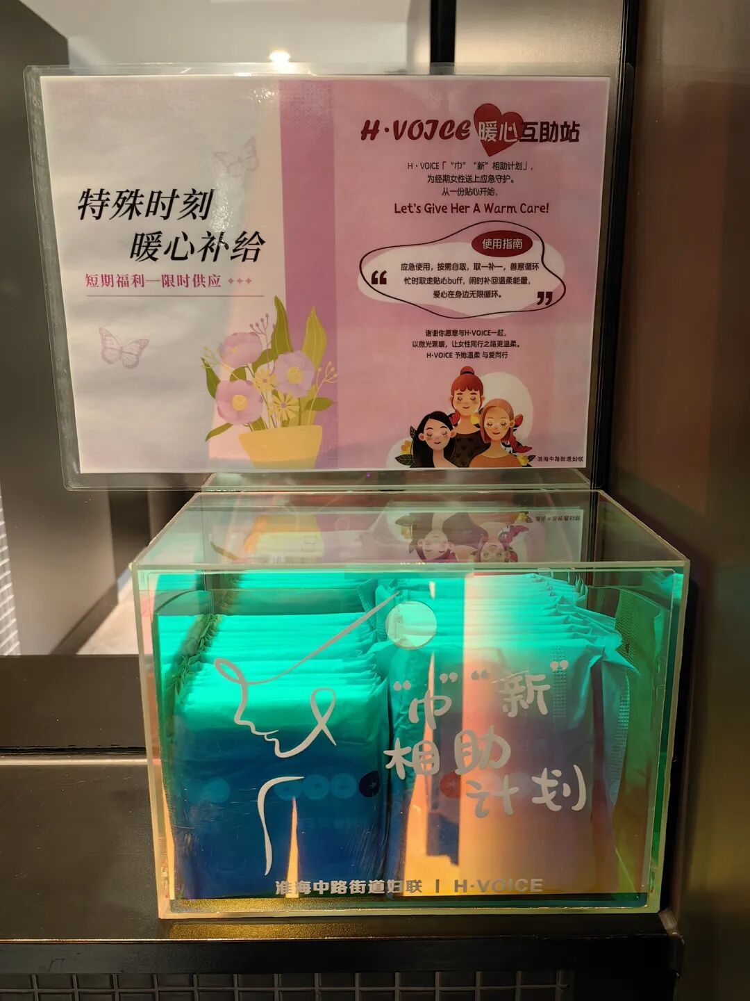 更让人暖心的是盒子里藏着的“善意循环”——“应急使用,按需自取,取一补一”的简单提示,成了商圈楼宇里陌生人之间的默契约定。有人急需时取走一片,转头就补来几包;楼宇白领、商圈从业者、律所职场人,还有收到专属关怀的女环卫工们,都悄悄成了温暖的传递者。没有强制要求,没有繁琐流程,善意就在淮海中路的商圈楼宇间、在一个个小盒子的取与补之间默默流转,让互助变成了无需言说的自觉。