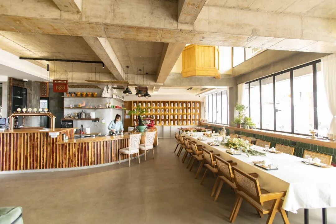 走入室内,宽敞大气的空间让人眼前一亮,家具与陈设中有不少气质出众的老物件,新颖又别致,既有岁月的沉淀感,又不失当代设计感。随处可见特色茶壶茶杯,创造出宁静、恬淡的环境,让人感受华亭春里的诗意茶生活。