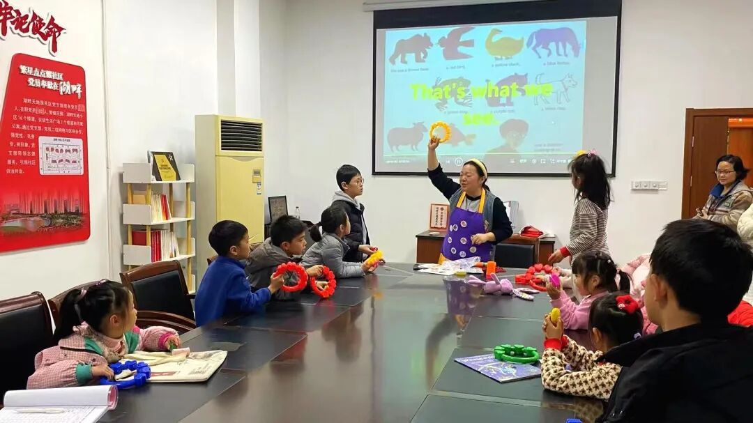 2月4日,湖畔天地小区活动室里童声笑语此起彼伏。志愿者老师带领十几名小朋友沉浸在英语绘本《BROWN BEAR》的世界,配合生动的动物叫声模仿,引得现场欢笑不断。趣味游戏环节,孩子们玩起英文单词“寻宝”;手工创作时间,大家动手制作彩色转盘,通过贴纸、色彩和小机关的巧妙组合,一个会转动的小作品在指尖诞生。小学生乔纾泽兴奋地展示成果:“我最喜欢找动物贴纸的游戏,找到了好多!”湖畔天地居民区党支部书记俞祝玲介绍:“这仅是系列活动的开端,后续还有‘幸运摇摇马制作’‘元宵花灯制作’等精彩内容,让孩子们的假期充实又有趣。”