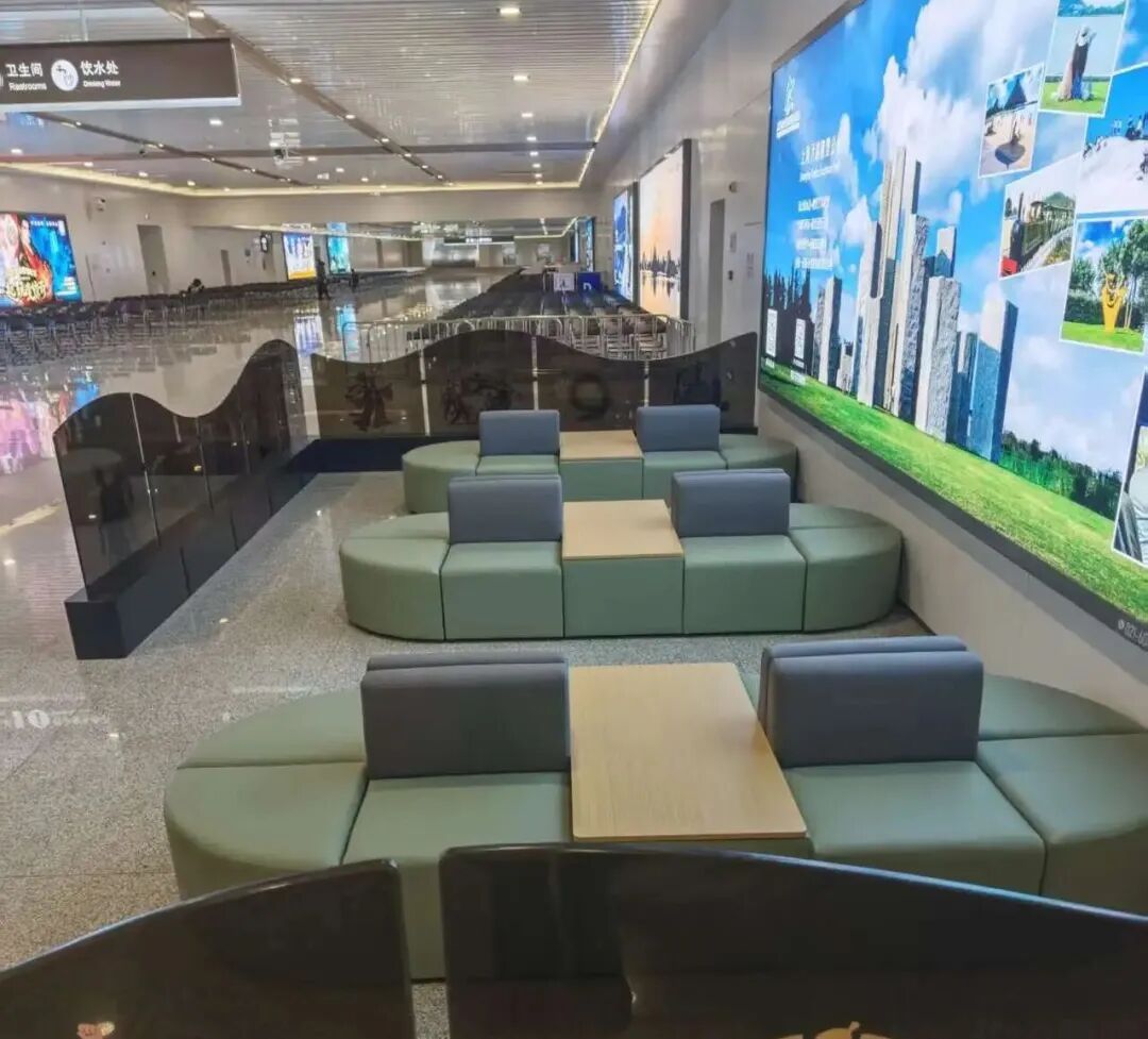 硬件设施升级的用心都体现在细节中。在负一层的旅客休息区,车站专门增设了“老幼病残孕爱心专区”。半透明围栏上装饰着松江琴派、泗泾十锦细锣鼓、叶榭竹编等地方文化符号,区域内配备沙发软座,营造出安静温暖的候车环境。网约车候车区的座椅也悄然升级,材质从铝合金改为软塑料,围栏上点缀着松江地标图案,让短暂等候也如一场微型的城市观光。