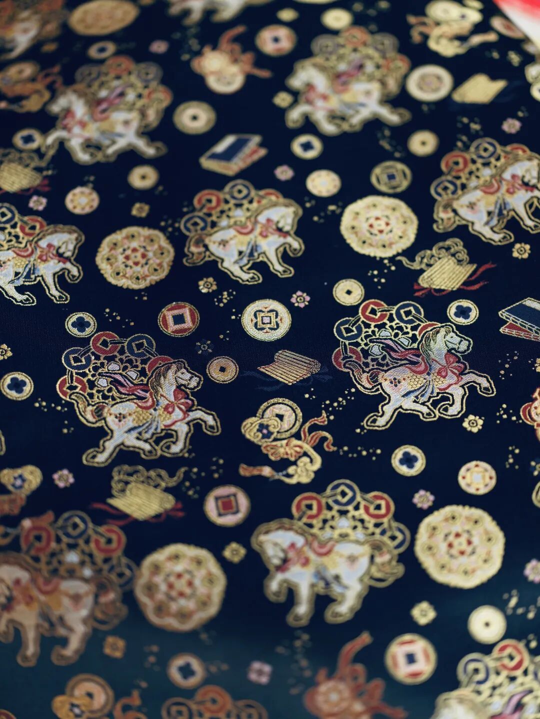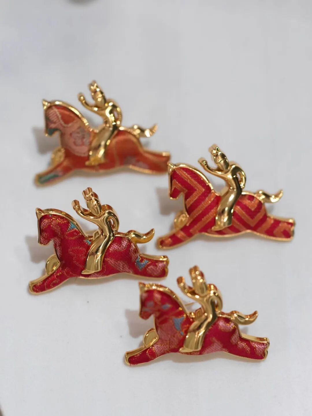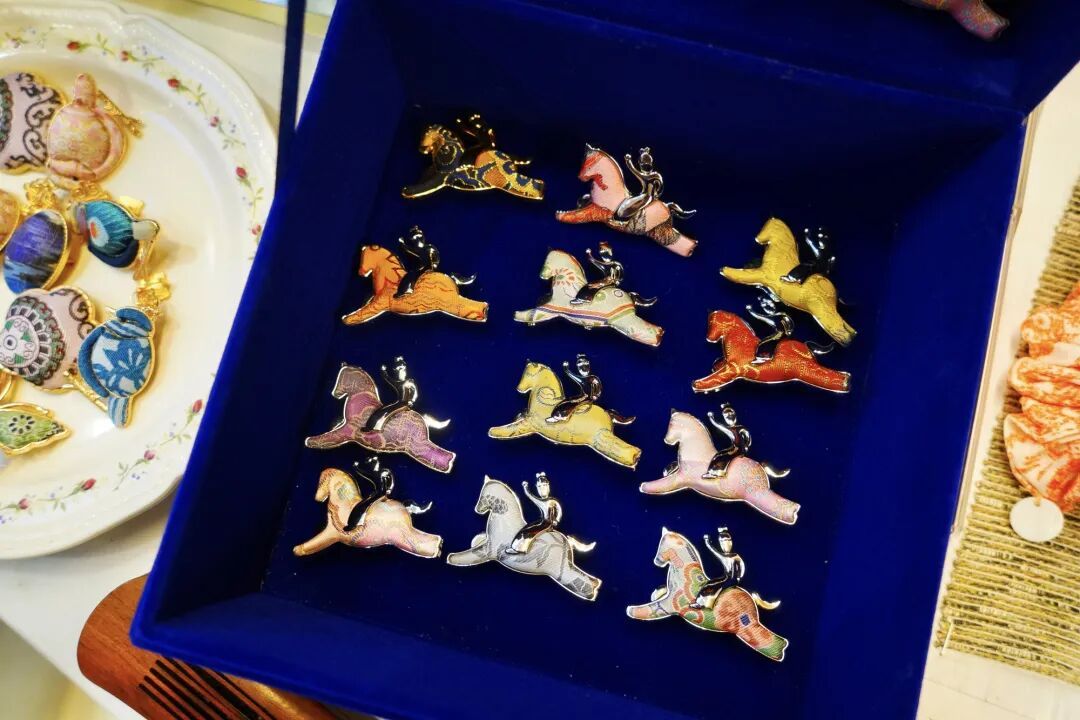 “马到成功”“马上有钱”“飞黄腾达”和马有关的成语,总是那么积极向上,还包含着对未来的美好期许。施意和她的团队设计的爆款之一——仕女马球胸针,灵感来源于唐代仕女打马球的形象,在唐代风靡一时,现代却很少见。作为女性创作者,把来自唐代的康健勇敢的形象带给现代消费者,一开售便受到了众多顾客的追捧。胸针金银两种色搭配上手工装裱的苏州宋锦,颜色华丽,各种吉祥如意的图案在岁末看着特别喜庆。