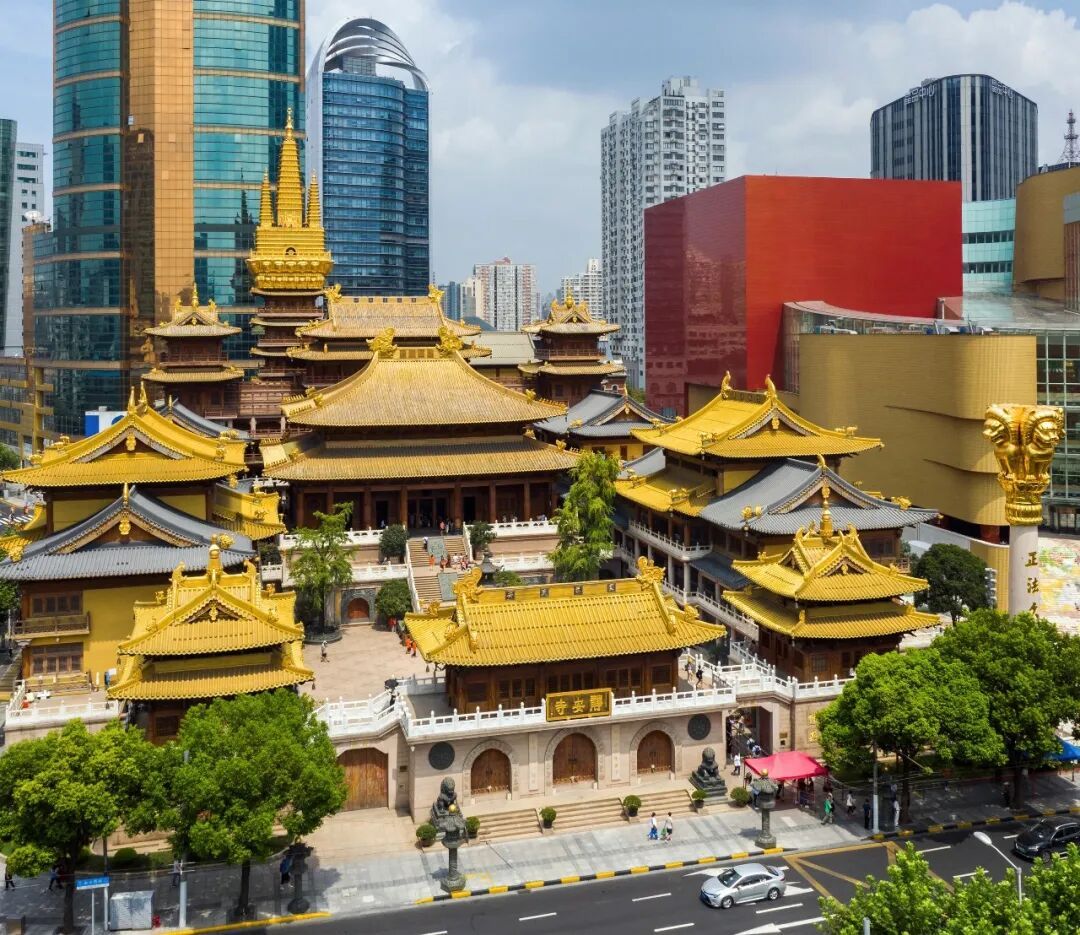 千年古寺,新春祈福圣地,黄墙金瓦与现代商圈相映成趣。华山路天桥是拍摄静安寺与城市天际线的网红机位,在此定格新春城市全景。