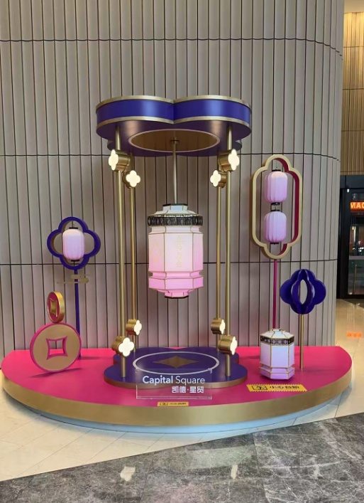 凯德星贸商务楼,大堂空间被精心打造成一处典雅而新颖的新春艺境。一座精美的中式景观成为视觉焦点,金色立柱擎起数盏粉色渐变的中式灯笼,灯笼纱面上饰有清雅文字,柔光透出,为现代感的线条空间晕染上朦胧的喜庆。