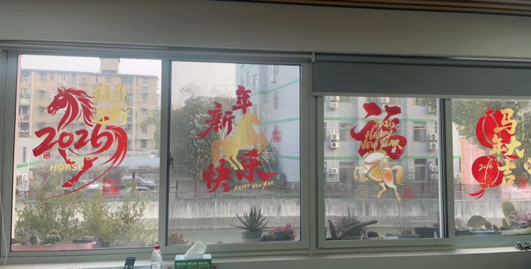 不远处,和泰花园居民区新时代文明实践站同样红火。沿河的玻璃窗上张贴了各式窗花,拼在一起就是对整个社区的祝福。