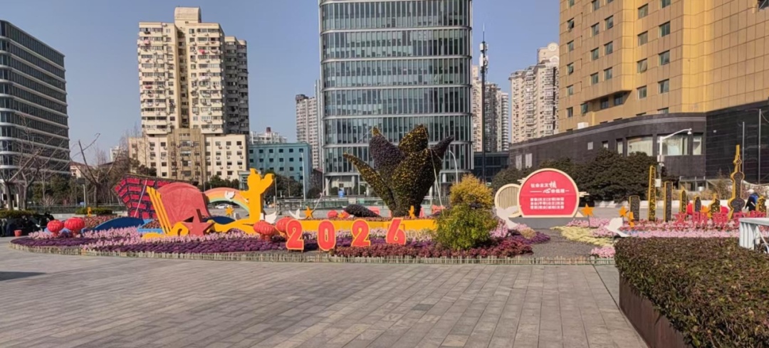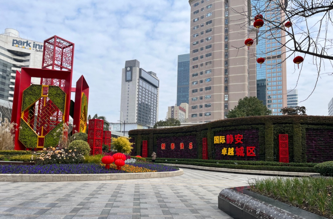 沿着恒丰路向南,共和新路路口的绿化带里悄然换了新装。红色“新春快乐”4字小品立于花草间,周围点缀着红色小花。这处“年味绿化小品”不大,却像一枚精致的胸针,别在街道的衣襟上。