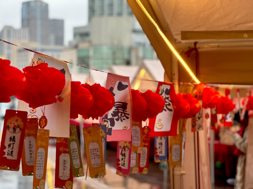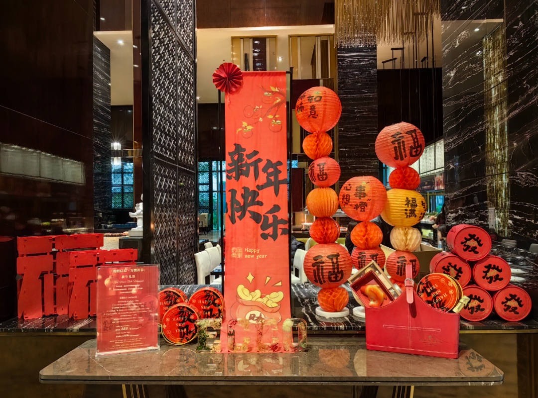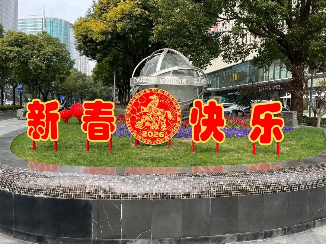 静安国际中心内,一面巨大的迎新年背景板矗立在大厅,橙红渐变的底色宛如旭日东升,上方垂挂着一盏盏圆润的红灯笼。“马跃新程 金鞍逐梦”八个书法大字笔力雄健,道出对新年的昂扬期盼,周围环绕着“福运满满”“喜气洋洋”等各式吉祥祝语。传统纹样、书法艺术与现代商业空间在此巧妙融合,引得往来行人纷纷驻足,在这匹奔腾的“福马”前拍照,让传统年味成为一张张时尚的“新春打卡照”。
