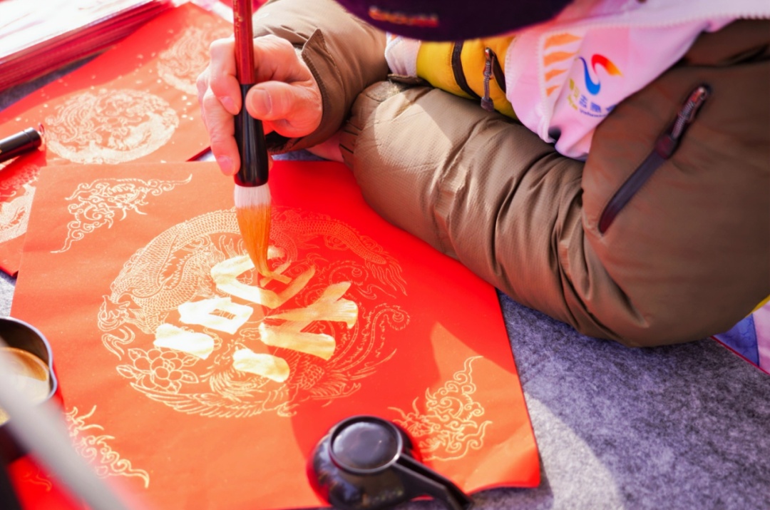 写“福”字的摊位最为热闹。不同年龄的人在这里找到了共同的乐趣:孩子们专注地描摹笔画,年轻人尝试创意字体设计,老人则背着手轻声指导“这一竖要写得直,才撑得住福气”。