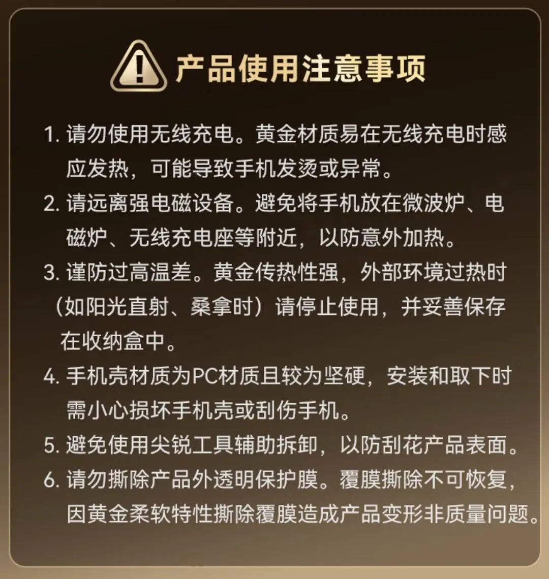 记者在该产品的使用注意事项中看到,商家特别提醒“请勿使用无线充电”,因黄金材质易在无线充电时感应发热,可能导致手机发烫或异常。