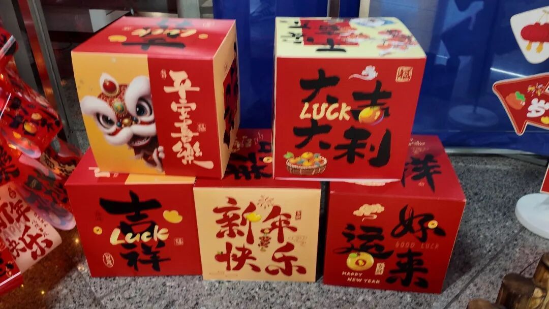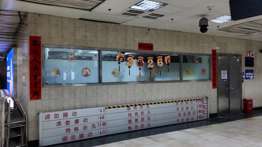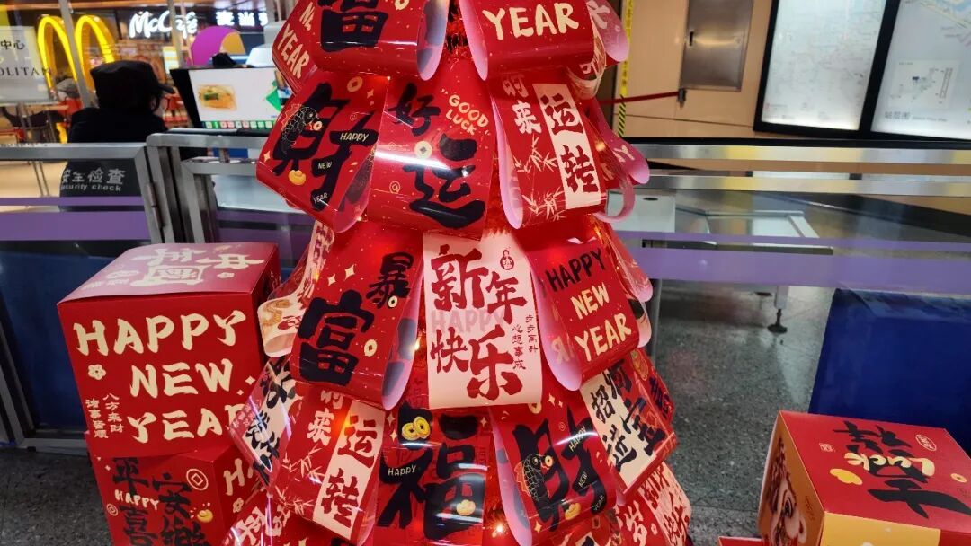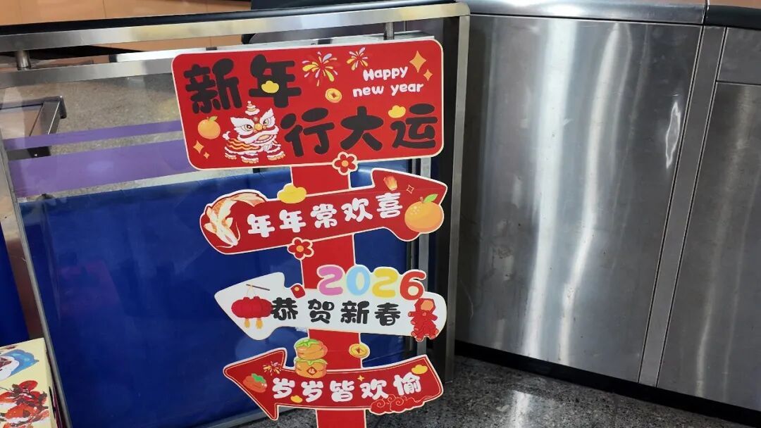 除了醒目的装饰,地铁站内还摆放了许多寓意吉祥的装饰物品。红色礼盒堆叠在一起,上面印着“大吉大利”“新年快乐”等字样,传递着对新年的美好期许。一旁的“红包树”上挂满了红包和祝福语,吸引不少乘客驻足观看、拍照留念。地铁站通道上方,一串串红色装饰物和“新年快乐”横幅高高悬挂,形成亮丽风景线。服务中心上方的“福”字和“2026”装饰,更让整个地铁站充满浓浓的春节氛围。