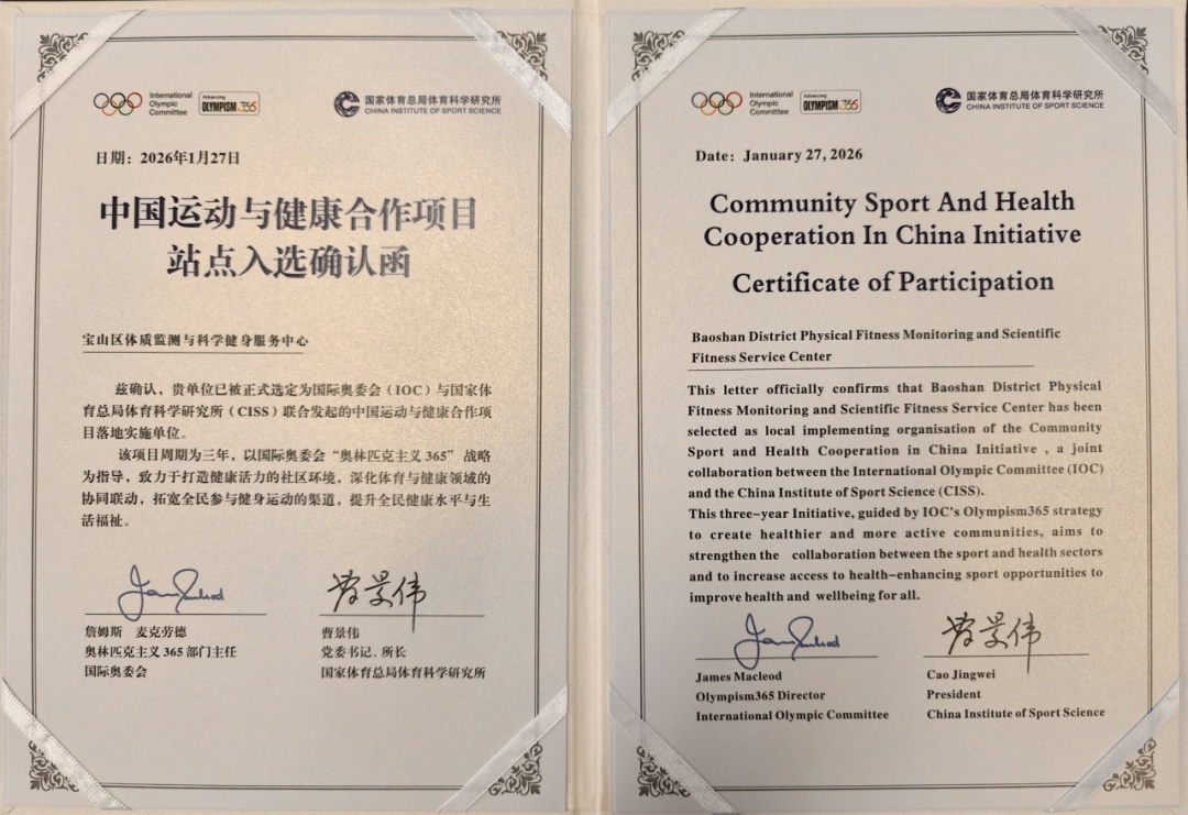 近日,上海市宝山区体质监测与科学健身服务中心、杨浦区殷行社区运动健康中心两个站点成功入选国家体育总局体育科学研究所与国际奥委会奥林匹克主义365部门共同打造的“中国运动与健康合作项目”。