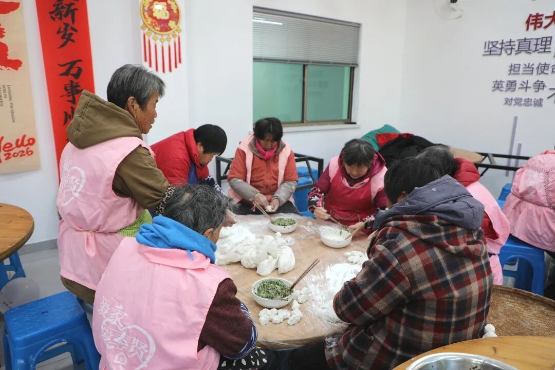 点心制作区温情满满,村民围坐在一起,搓汤圆、蒸焋糕,手中的不仅是传统美食,更是邻里间流动的情谊。
