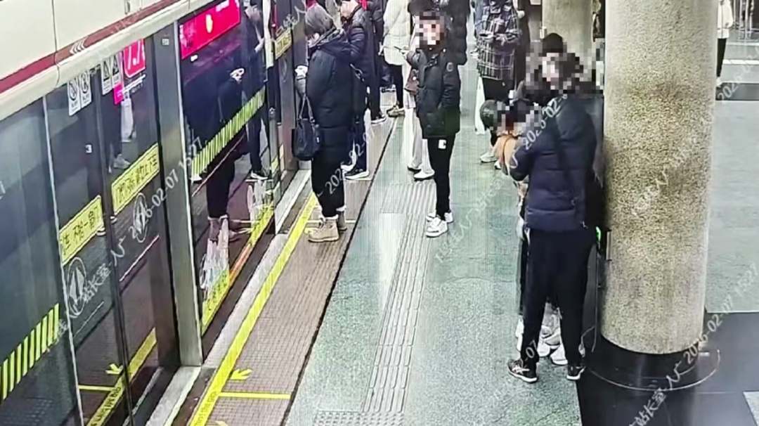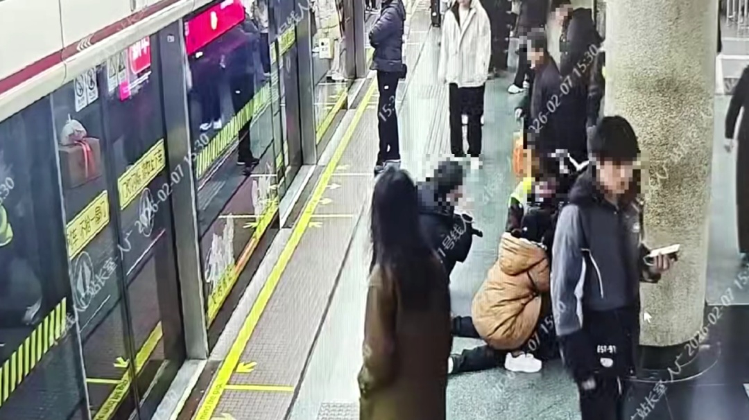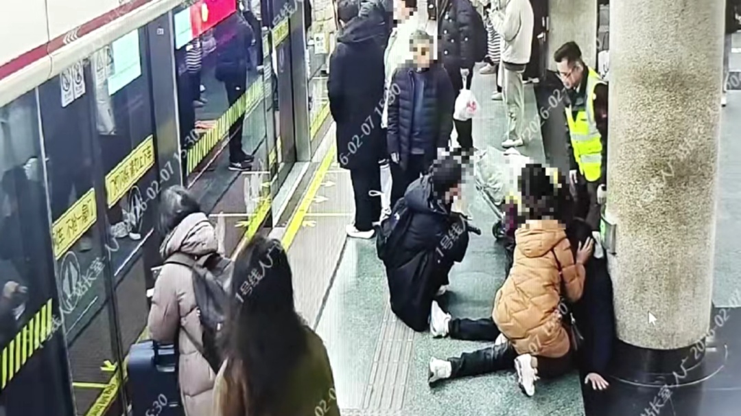 公共视频画面显示,当日下午,一名乘客在列车上突然身体不适,随后昏倒在车厢内,血压偏低,情况十分危急。幸运的是,乘客家属及时发现这一状况,迅速将其带至1、2、8号线人民广场站的站台上。