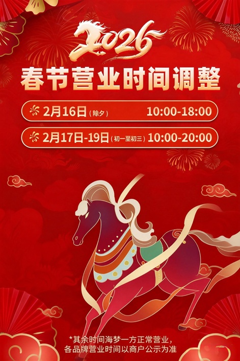 春节不必出远门, 家门口就有浓浓年味! 好吃好玩、带娃放电, 海梦一方陪你过大年! 农历春节·持续逐梦 为了方便大家春节出行 走亲访友顺路逛一逛 海梦一方春节期间 营业时间做了微调 尽兴游玩、激爽吃喝、尽情购买 春节来海梦一方 有灯亮、有门开、有人气 过年就要热热闹闹 过春节图的就是热闹气氛 海梦一方在春节期间精心策划 把你过年的情绪拉满格!